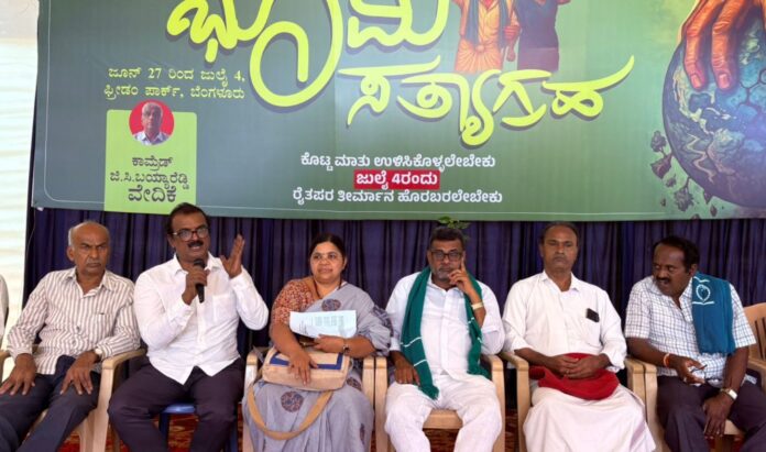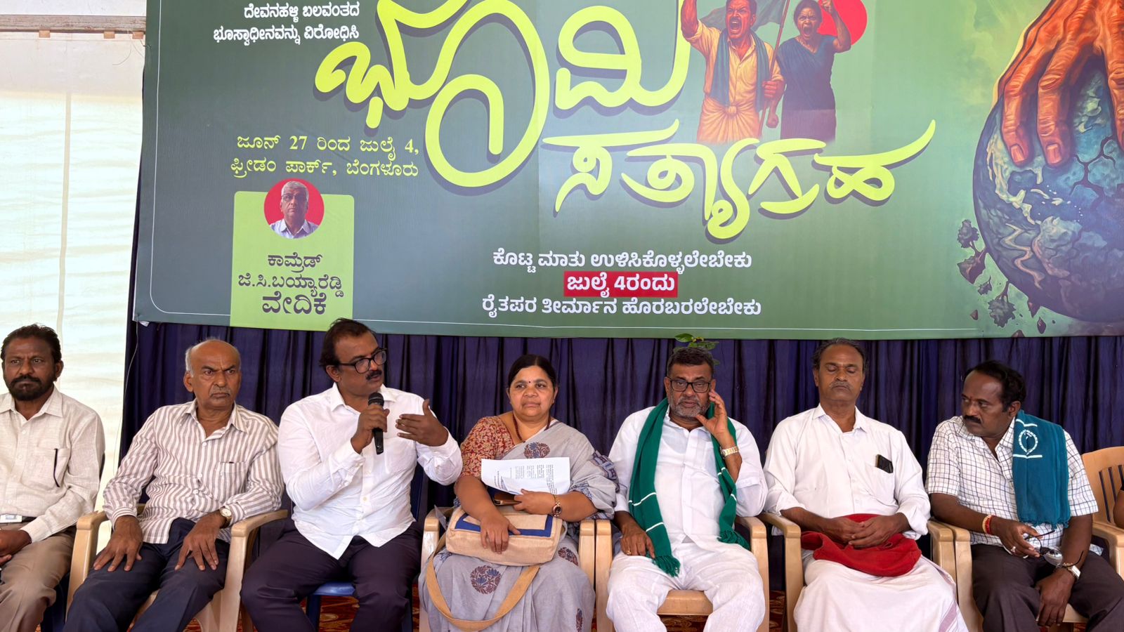 ಭೂ ಸ್ವಾಧೀನ ವಿರೋಧಿಸಿ ‘ಭೂಮಿ ಸತ್ಯಾಗ್ರಹ’ ನಡೆಯುತ್ತಿರುವ ಫ್ರೀಡಂ ಪಾರ್ಕ್ನಲ್ಲಿ ಭಾನುವಾರ ಪತ್ರಿಕಾಗೋಷ್ಠಿ ನಡೆಸಿ ಮಾತನಾಡಿದ ಸಂಯುಕ್ತ ಹೋರಾಟ ಕರ್ನಾಟ, ಭೂ ಸ್ವಾಧೀನ ವಿರೋಧಿ ಹೋರಾಟ ಸಮಿತಿ ಹಾಗೂ ಸಮಾನ ಮನಸ್ಕ ಸಂಘಟನೆಗಳ ಮುಖಂಡರು,” ಸಮಾವೇಶದಲ್ಲಿ ರಾಜ್ಯದ ಎಲ್ಲಾ ತಾಲೂಕುಗಳಿಂದಲೂ ಸಮಾನ ಮನಸ್ಕರು ದೊಡ್ಡ ಸಂಖ್ಯೆಯಲ್ಲಿ ಪಾಲ್ಗೊಳ್ಳಲಿದ್ದಾರೆ” ಎಂದು ತಿಳಿಸಿದರು.