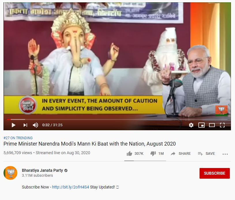 ಹತ್ತುಲಕ್ಷ ಡಿಸ್‌ಲೈಕ್ ಗಳಿಸಿ, ಪ್ರಧಾನಿ ಮೋದಿಯ ‘ಮನ್-ಕಿ-ಬಾತ್’ ಕಾರ್ಯಕ್ರಮ ದಾಖಲೆ ಬರೆದಿದೆ. ಅದಾಗ್ಯೂ ಡಿಸ್‌ಲೈಕ್‌ಗಳನ್ನು ಡಿಲೀಟ್ ಮಾಡಲಾಗುತ್ತಿದೆ ಎಂಬ ಆರೋಪ ಕೇಳಿ ಬರುತ್ತಿದೆ.
