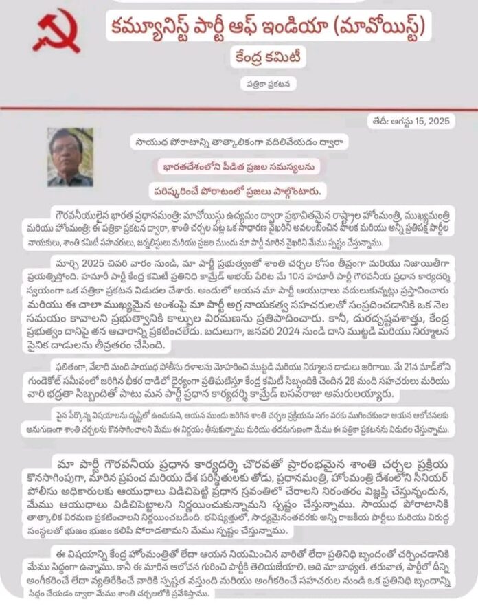 ಆದರೆ, ಈ ವಿಷಯದ ಕುರಿತು ಸರ್ಕಾರವು ತನ್ನ ನಿಖರವಾದ ನಿಲುವನ್ನು ಸ್ಪಷ್ಟಪಡಿಸಬೇಕಿದೆ. ಈ ಸಂದೇಶವನ್ನು ಮಾಧ್ಯಮ ಮತ್ತು ಸರ್ಕಾರದಂತಹ ವಿವಿಧ ಸಂಸ್ಥೆಗಳಿಗೆ ತಲುಪಿಸಲು ಮಾವೋವಾದಿ ನಾಯಕತ್ವವು ಬಯಸಿದೆ ಎಂದು ಪತ್ರದಲ್ಲಿ ಉಲ್ಲೇಖಿಸಲಾಗಿದೆ. ಜೈಲಿನಲ್ಲಿರುವ ‘ಕಾಮ್ರೇಡ್ಗಳು’ ಮತ್ತು ಇತರ ಸ್ಥಳಗಳಲ್ಲಿರುವ ಪಕ್ಷದ ಸದಸ್ಯರೊಂದಿಗೆ ಚರ್ಚೆ ನಡೆಸಲು ಅವಕಾಶ ಒದಗಿಸಬೇಕು ಎಂದೂ ಪತ್ರದಲ್ಲಿ ಮನವಿ ಮಾಡಲಾಗಿದೆ.