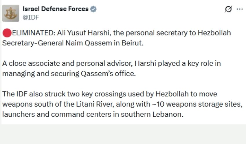 “ನಿನ್ನೆ, ಐಡಿಎಫ್ ಬೈರುತ್ ಪ್ರದೇಶದಲ್ಲಿ ದಾಳಿ ನಡೆಸಿ, ಹಿಜ್ಬೊಲ್ಲಾ ಪ್ರಧಾನ ಕಾರ್ಯದರ್ಶಿ ನಯೀಮ್ ಖಾಸಿಮ್ ಅವರ ಸೋದರಳಿಯ ಮತ್ತು ವೈಯಕ್ತಿಕ ಕಾರ್ಯದರ್ಶಿ ಅಲಿ ಯೂಸುಫ್ ಹರ್ಷಿಯನ್ನು ಹತ್ಯೆ ಮಾಡಿದೆ” ಎಂದು ಮಿಲಿಟರಿ ಹೇಳಿಕೆ ತಿಳಿಸಿದೆ.