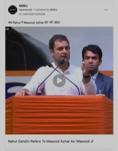 ಆದರೆ ರಾಹುಲ್ ಗಾಂಧಿ ಬಿಜೆಪಿಯನ್ನು ಖಂಡಿಸುವ ಭಾಗವನ್ನು ತೆಗೆದುಹಾಕಿ “ರಾಹುಲ್ ಗಾಂಧಿ ಮಸೂದ್ ಅಜರ್‌ಜಿ ಎಂದು ಕರೆದಾಗ” ಎಂಬ ಶೀರ್ಷಿಕೆಯೊಂದಿಗೆ NEWJ ಎಂಬ ಲೋಗೋದೊಂದಿಗೆ ಸುದ್ದಿ ವರದಿಯಂತಹ ತಿರುಚಿದ ಈ ವಿಡಿಯೋ ಫೇಸ್‌ಬುಕ್‌ನಲ್ಲಿ ಜಾಹೀರಾತಿನಂತೆ ಪ್ರಸಾರವಾಯಿತು. ನಾಲ್ಕು ದಿನಗಳಲ್ಲಿ ಸರಿಸುಮಾರು 6,50,000 ಜನರು ಆ ವಿಡಿಯೋ ನೋಡಿದರು ಮತ್ತು ಆ ಮೂಲಕ ರಾಹುಲ್ ಗಾಂಧಿ ಭಯೋತ್ಪಾದಕರನ್ನು ಬೆಂಬಲಿಸುತ್ತಾರೆ ಎಂಬ ಸುಳ್ಳು ಕಥನ ಕಟ್ಟಲಾಯಿತು.
