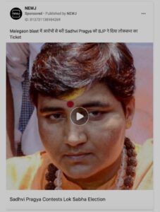 ಭಯೋತ್ಪಾದನೆಯಲ್ಲಿ ಭಾಗಿಯಾದ ಆರೋಪ ಹೊತ್ತಿರುವ, ಹಿಂದೂ ಸಾದ್ವಿ ಎಂದು ಕರೆಯಲ್ಪಡುವ ಪ್ರಗ್ಯಾ ಸಿಂಗ್ ಠಾಕೂರ್‌ರವರನ್ನು ಬಿಜೆಪಿ 2019ರ ಲೋಕಸಭಾ ಚುನಾವಣೆಯಲ್ಲಿ ತನ್ನ ಅಭ್ಯರ್ಥಿಯೆಂದು ಘೋಷಿಸಿತು. ಅವರು ನಾಮಪತ್ರ ಸಲ್ಲಿಸಿದ ಕೂಡಲೇ ಅವರ ಕುರಿತು ಸುದ್ದಿಯಂತಿರುವ “ತಪ್ಪು ಮಾಹಿತಿಯ” ಹೆಡ್‌ಲೈನ್‌ ಇರುವ ವರದಿಯೊಂದನ್ನು ಜಾಹೀರಾತಿನ ರೂಪದಲ್ಲಿ ಫೇಸ್‌ಬುಕ್‌ ಪ್ರಕಟಿಸಿತು.