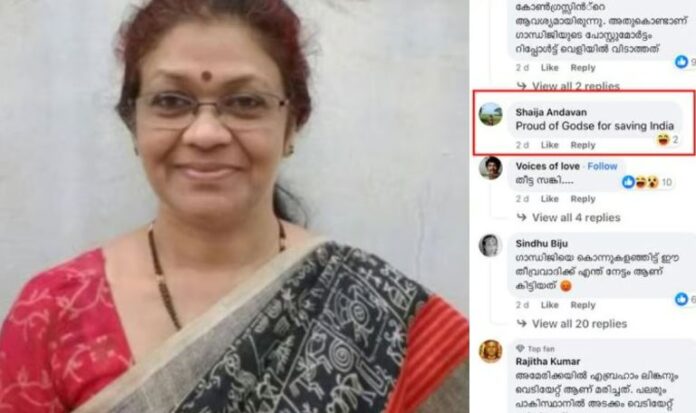 ಗೋಡ್ಸೆಯ ಛಾಯಾಚಿತ್ರವನ್ನು ಹಂಚಿಕೊಂಡ ಕೃಷ್ಣ ರಾಜ್ ಮಲಯಾಳಂನಲ್ಲಿ, ಹಿಂದೂ ಮಹಾಸಭಾ ಸದಸ್ಯ ನಾಥೂರಾಂ ಗೋಡ್ಸೆ,’ಭಾರತದ ಅನೇಕ ಜನರ ವೀರ’ ಎಂದು ಪೋಸ್ಟ್‌ ಮಾಡಿದ್ದರು. ಇದಕ್ಕೆ ಪ್ರತಿಕ್ರಿಯಿಸಿದ ಶೈಜಾ ಆಂಡವನ್ ಭಾರತವನ್ನು ಉಳಿಸಿದ್ದಕ್ಕಾಗಿ ಗೋಡ್ಸೆಯ ಬಗ್ಗೆ ಹೆಮ್ಮೆಯಿದೆ ಎಂದು ಹೇಳಿದ್ದಾರೆ.