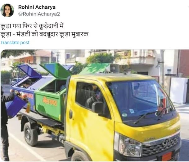 ಬಿಹಾರದಲ್ಲಿ ಸಿಎಂ ಹುದ್ದೆಗೆ ನಿತೀಶ್‌ ಕುಮಾರ್‌ ರಾಜೀನಾಮೆ ನೀಡಿದ ಬಗ್ಗೆ ಪ್ರತಿಕ್ರಿಯಿಸಿದ ಮಾಜಿ ಮುಖ್ಯಮಂತ್ರಿ ಮತ್ತು ಆರ್‌ಜೆಡಿ ಮುಖ್ಯಸ್ಥ ಲಾಲು ಪ್ರಸಾದ್ ಯಾದವ್ ಅವರ ಪುತ್ರಿ ರೋಹಿಣಿ ಆಚಾರ್ಯ, ನಿತೀಶ್ ಕುಮಾರ್ ಅವರನ್ನು ತರಾಟೆಗೆ ತೆಗೆದುಕೊಂಡಿದ್ದು  ‘ಕಸ ಈಗ ಮತ್ತೆ ತೊಟ್ಟಿಗೆ ಸೇರಿದೆ’ ಎಂದು ಹೇಳಿದ್ದಾರೆ.