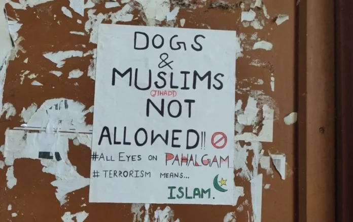 ದ್ವೇಷದ ಪೋಸ್ಟರ್ನಲ್ಲಿ “ನಾಯಿಗಳು ಮತ್ತು ಮುಸ್ಲಿಮರಿಗೆ ಅವಕಾಶವಿಲ್ಲ” ಎಂದು ಬರೆಯಲಾಗಿದೆ.