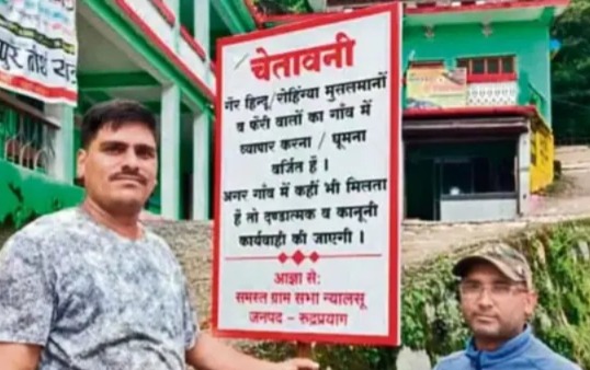 ಉತ್ತರಾಖಂಡದ ರುದ್ರಪಯಾಗ್ ಜಿಲ್ಲೆಯಾದ್ಯಂತ ಹಲವೆಡೆ ‘ಹಿಂದೂಯೇತರರು, ರೋಹಿಂಗ್ಯಾ ಮುಸ್ಲಿಮರು ಮತ್ತು ಬೀದಿ ಬದಿ ವ್ಯಾಪಾರಿ’ಗಳ ಪ್ರವೇಶವನ್ನು ನಿಷೇಧಿಸುವ ಫಲಕವನ್ನು ಹಾಕಲಾಗಿದೆ ಎಂದು ವರದಿಯಾಗಿದೆ. ಭಾನುವಾರ ಸಾಮಾಜಿಕ ಜಾಲತಾಣಗಳಲ್ಲಿ ಫಲಕವೊಂದರ ಫೋಟೋ ಹರಿದಾಡಿದೆ.