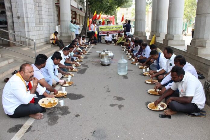 ಮಂಡ್ಯ: ‘87ನೇ ಅಖಿಲ ಭಾರತ ಕನ್ನಡ ಸಾಹಿತ್ಯ ಸಮ್ಮೇಳನದಲ್ಲಿ ಬಾಡೂಟ ನೀಡಬೇಕು’ ಎಂದು ಆಗ್ರಹಿಸಿ ವಿವಿಧ ಸಂಘಟನೆಗಳ ಕಾರ್ಯಕರ್ತರು ಜಿಲ್ಲಾಧಿಕಾರಿ ಕಚೇರಿ ಆವರಣದಲ್ಲಿ ಶನಿವಾರ ಮಾಂಸಾಹಾರ ಸೇವಿಸಿ ಪ್ರತಿಭಟಿಸಿದರು.