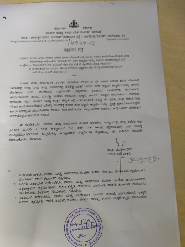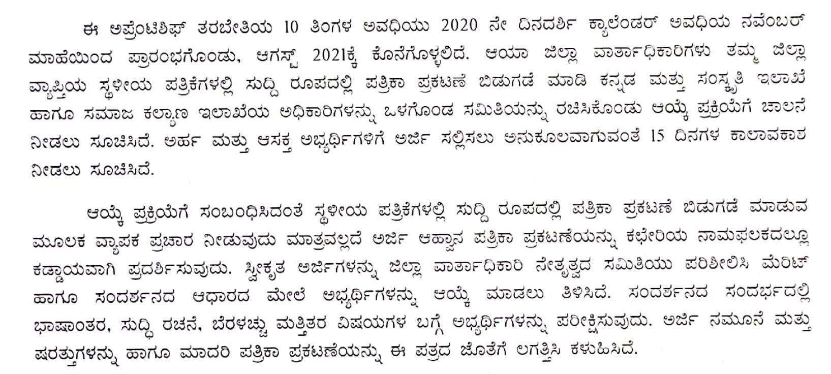 “ವಾರ್ತಾ ಮತ್ತು ಸಾರ್ವಜನಿಕ ಸಂಪರ್ಕ ಇಲಾಖೆ 2020-21ನೇ ಸಾಲಿನ ವಿಶೇಷ ಘಟಕ ಯೋಜನೆ ಅಡಿಯಲ್ಲಿ ರಾಜ್ಯ ಎಲ್ಲ ಜಿಲ್ಲಾ ಕಚೇರಿಗಳಲ್ಲಿ ಪರಿಶಿಷ್ಟ ಜಾತಿಗೆ ಸೇರಿದ ತಲಾ ಇಬ್ಬರು ಅಭ್ಯರ್ಥಿಗಳನ್ನು ಹಾಗೂ ಬೆಂಗಳೂರು ನಗರ, ಬೆಂಗಳೂರು ಗ್ರಾಮಾಂತರ, ಚಿತ್ರದುರ್ಗ, ಕೋಲಾರ, ರಾಮನಗರ, ತುಮಕೂರು, ಚಾಮರಾಜನಗರ, ಹಾಸನ, ಮಂಡ್ಯ, ಉಡುಪಿ, ಕಲಬುರಗಿ, ಬಳ್ಳಾರಿ, ಬೀದರ್, ಕೊಪ್ಪಳ, ರಾಯಚೂರು, ಬೆಳಗಾವಿ, ಧಾರಾವಾಡ, ಗದಗ, ಹಾವೇರಿ ಮತ್ತು ಉತ್ತರ ಕನ್ನಡ ಜಿಲ್ಲೆ ಒಳಗೊಂಡಂತೆ ಆಯ್ದ ಈ ಇಪ್ಪತ್ತು ಜಿಲ್ಲಾ ಕಚೇರಿಗಳಲ್ಲಿ ಗಿರಿಜನ ಉಪಯೋಜನೆಯಡಿ ಪರಿಶಿಷ್ಟ ಪಂಗಡಕ್ಕೆ ಸೇರಿದ ತಲಾ ಒಬ್ಬರು ಅಭ್ಯರ್ಥಿಯನ್ನು ಕ್ಷೇತ್ರ ಪ್ರಚಾರ ಕಾರ್ಯಕ್ರಮ ಹಾಗೂ ಮಾಧ್ಯಮ ಚಟುವಟಿಕೆಗಳ ಕಾರ್ಯ ನಿರ್ವಹಣೆ ಕುರಿತು ಹತ್ತು-ತಿಂಗಳ ಅವಧಿಯ ಅಪ್ರೆಂಟಿಶಿಪ್ ತರಬೇತಿಗೆ ತೆಗೆದುಕೊಳ್ಳಲು ಅನುಮತಿ ನೀಡಿದೆ”