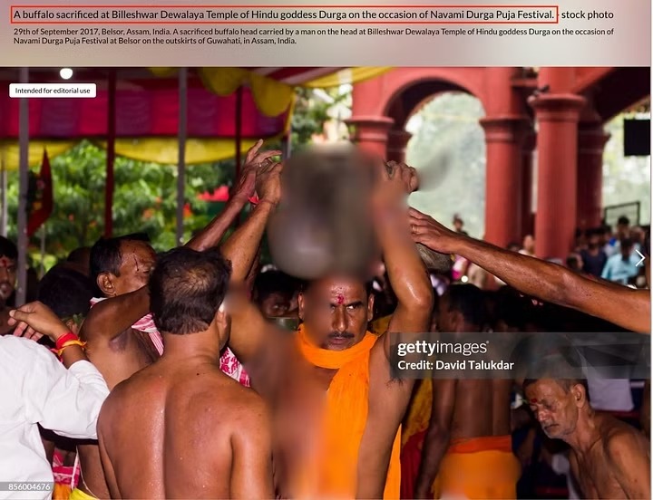 ಗೂಗಲ್‌ ರಿವರ್ಸ್ ಇಮೇಜ್‌ನಲ್ಲಿ ವೈರಲ್ ಫೋಟೋವನ್ನು ಹುಡುಕಾಡಿದಾಗ “ನವಮಿ ದುರ್ಗಾ ಪೂಜೆ ಹಬ್ಬದ ಸಂದರ್ಭದಲ್ಲಿ ಹಿಂದೂ ದೇವತೆ ದುರ್ಗೆಯ ಬಿಲ್ಲೇಶ್ವರ ದೇವಸ್ಥಾನದಲ್ಲಿ ಕೋಣ ಬಲಿ ನೀಡಲಾಗಿದೆ” ಎಂಬ ಶೀರ್ಷಿಕೆಯೊಂದಿಗೆ ಗೆಟ್ಟಿ ಇಮೇಜಸ್ ಫೋಟೋ ಪೋಸ್ಟ್ ಮಾಡಿರುವುದು ಕಂಡು ಬಂದಿದೆ.