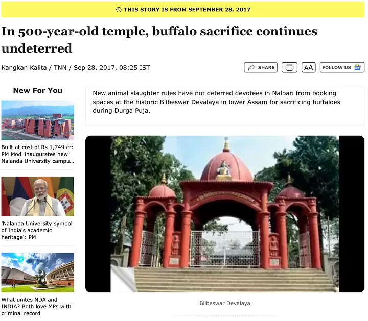ನಾವು ಇನ್ನಷ್ಟು ಮಾಹಿತಿ ಹುಡುಕಿದಾಗ “28 ಸೆಪ್ಟೆಂಬರ್ 2017 ರಂದು ಟೈಮ್ಸ್ ಆಫ್ ಇಂಡಿಯಾದಲ್ಲಿ ‘500 ವರ್ಷಗಳಷ್ಟು ಹಳೆಯದಾದ ದೇವಾಲಯದಲ್ಲಿ ಕೋಣ ಬಲಿಯು ನಿರಾತಂಕವಾಗಿ ಮುಂದುವರಿಯುತ್ತಿದೆ’ ಎಂಬ ಶೀರ್ಷಿಕೆಯೊಂದಿಗೆ ಪ್ರಕಟವಾದ ವರದಿಯೊಂದು ಲಭ್ಯವಾಗಿದೆ.