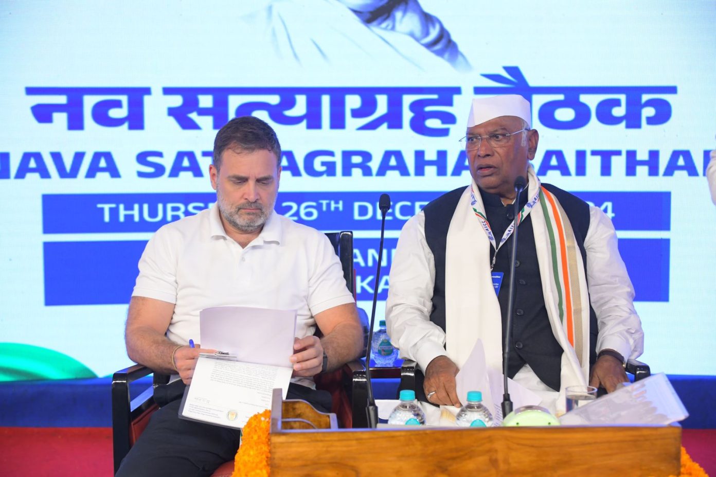 ಯುವ ಮತ್ತು ಸೈದ್ಧಾಂತಿಕ ಬದ್ಧತೆಯನ್ನು ನಾಯಕತ್ವದಲ್ಲಿ ತೊಡಗಿಸಿಕೊಳ್ಳುವ ಅಗತ್ಯದ ಬಗ್ಗೆ ಒತ್ತಿ ಹೇಳಿದ ಕಾಂಗ್ರೆಸ್ ಅಧ್ಯಕ್ಷ ಮಲ್ಲಿಕಾರ್ಜುನ ಖರ್ಗೆ, “2025 ಎಲ್ಲಾ ಖಾಲಿ ಹುದ್ದೆಗಳನ್ನು ಭರ್ತಿ ಮಾಡುವ ಮೂಲಕ ಸಂಘಟನಾ ಬಲವರ್ಧನೆಯ ವರ್ಷವಾಗಲಿದೆ; ಬೂತ್ನಿಂದ ಕೇಂದ್ರ ಮಟ್ಟದ ಚುನಾವಣೆಯನ್ನು ಗೆಲ್ಲಲು ಅಗತ್ಯವಾದ ಕೌಶಲ್ಯಗಳೊಂದಿಗೆ ಪಕ್ಷವನ್ನು ಸಜ್ಜುಗೊಳಿಸಲಾಗುವುದು” ಎಂದು ಹೇಳಿದರು. ಮಹಾತ್ಮಾ ಗಾಂಧೀಜಿಯವರ 100 ನೇ ವಾರ್ಷಿಕೋತ್ಸವದ ಸ್ಮರಣಾರ್ಥ ಬೆಳಗಾವಿಯಲ್ಲಿ ನಡೆದ ಕಾಂಗ್ರೆಸ್ ಕಾರ್ಯಕಾರಿ ಸಮಿತಿಯ ಸಭೆಯಲ್ಲಿ ಭಾಷಣ ಮಾಡಿದ ಅವರು, ಸಮಯಕ್ಕೆ ಬದ್ಧವಾದ ಘನ ಕಾರ್ಯತಂತ್ರ ಮತ್ತು … Continue reading ‘ಸ್ಥಳೀಯ ನಾಯಕತ್ವ ಬೆಳೆಸುವುದರ ಜೊತೆಗೆ ಯುವ ಜನರಿಗೆ ಅವಕಾಶ..’; ಬೆಳಗಾವಿ ಕಾಂಗ್ರೆಸ್ ಕಾರ್ಯಕಾರಿ ಸಮಿತಿಯ ಸಭೆಯಲ್ಲಿ ಖರ್ಗೆ ಹೇಳಿಕೆ
