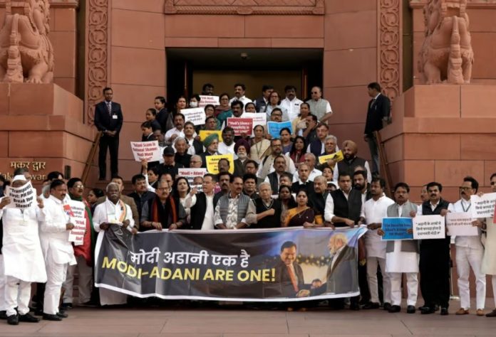 ಕಾಂಗ್ರೆಸ್, ಎಎಪಿ, ಆರ್‌ಜೆಡಿ, ಶಿವಸೇನೆ (ಯುಬಿಟಿ), ಡಿಎಂಕೆ ಮತ್ತು ಎಡಪಕ್ಷಗಳ ಸಂಸದರು ಸಂಸತ್ತಿನ ಮಕರ ದ್ವಾರದಲ್ಲಿ ಜಮಾಯಿಸಿ ಘೋಷಣೆಗಳನ್ನು ಕೂಗಿ ಆಕ್ರೋಶ ವ್ಯಕ್ತಪಡಿಸಿದರು. ಈ ವೇಳೆ ಅವರು ‘ಮೋದಿ-ಅದಾನಿ ಒಂದೇ’ ಎಂಬ ಬ್ಯಾನರ್ ಹಿಡಿದುಕೊಂಡಿದ್ದರು. ಪ್ರತಿಪಕ್ಷಗಳ ಪ್ರತಿಭಟನೆಯಿಂದ ಟಿಎಂಸಿ ದೂರವಿತ್ತು.