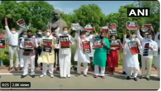 ರಾಜ್ಯಗಳಿಗೆ ಸರಕು ಮತ್ತು ಸೇವಾ ತೆರಿಗೆ (ಜಿಎಸ್‌ಟಿ) ಪಾವತಿಸುವಂತೆ ಒತ್ತಾಯಿಸಿ 8 ವಿರೋಧ ಪಕ್ಷಗಳ ಸಂಸದರು ಸಂಸತ್ ಭವನದ ಆವರಣದಲ್ಲಿರುವ ಮಹಾತ್ಮ ಗಾಂಧಿ ಪ್ರತಿಮೆಯ ಮುಂದೆ ಪ್ರತಿಭಟನೆ ನಡೆಸಿದರು.