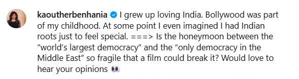 “ನಾನು ಭಾರತವನ್ನು ಪ್ರೀತಿಸುತ್ತಾ ಬೆಳೆದವಳು. ಬಾಲಿವುಡ್ ನನ್ನ ಬಾಲ್ಯದ ಒಂದು ಭಾಗವಾಗಿತ್ತು. ಒಂದು ಹಂತದಲ್ಲಂತೂ, ನನ್ನನ್ನು ನಾನು ವಿಶೇಷವಾಗಿ ಭಾವಿಸಿಕೊಳ್ಳಲು ನನಗೂ ಭಾರತೀಯ ಮೂಲದ ನಂಟಿದೆ ಎಂದು ಊಹಿಸಿಕೊಳ್ಳುತ್ತಿದ್ದೆ. ‘ವಿಶ್ವದ ಅತಿದೊಡ್ಡ ಪ್ರಜಾಪ್ರಭುತ್ವ’ ಮತ್ತು ‘ಮಧ್ಯಪ್ರಾಚ್ಯದ ಏಕೈಕ ಪ್ರಜಾಪ್ರಭುತ್ವ’ ರಾಷ್ಟ್ರಗಳ ನಡುವಿನ ಈ ಸಂಬಂಧದ ಅವಧಿ ಎಷ್ಟು ದುರ್ಬಲವಾಗಿದೆಯೆಂದರೆ, ಒಂದು ಚಲನಚಿತ್ರ ಅದನ್ನು ಮುರಿದುಬಿಡಬಹುದೇ?” ಎಂದು ಚಿತ್ರದ ನಿರ್ದೇಶಕಿ ಬೆನ್ ಹನಿಯಾ ಅವರು ಫೇಸ್ಬುಕ್ ಪೋಸ್ಟ್ನಲ್ಲಿ ಪ್ರಶ್ನಿಸಿದ್ದಾರೆ.