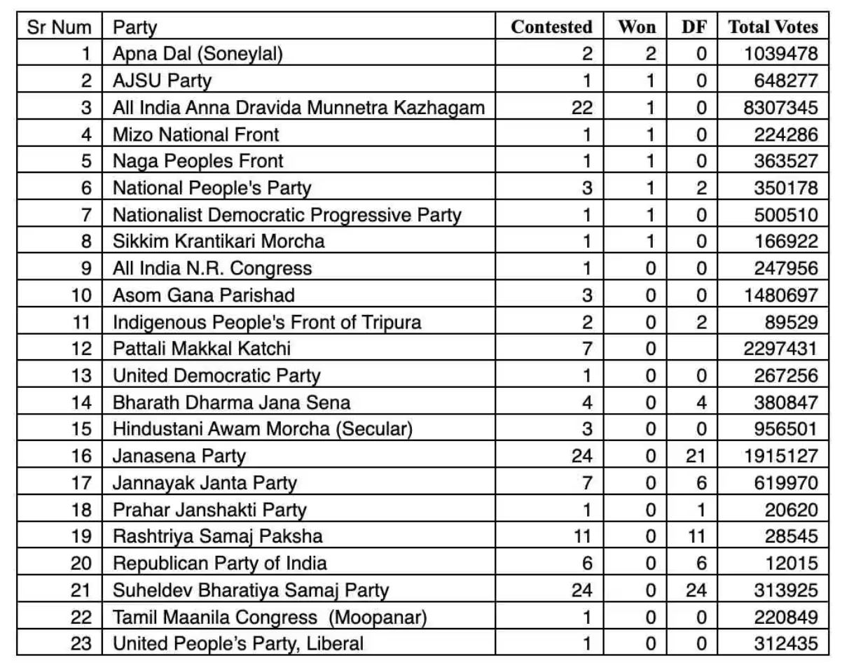 ಸದ್ಯ ಎನ್‌ಡಿಎ ಜೊತೆ ಗುರುತಿಸಿಕೊಂಡಿರುವ 15 ಪಕ್ಷಗಳು ಒಂದೂ ಸ್ಥಾನ ಗೆಲ್ಲಲು ಸಾಧ್ಯವಾಗಿರಲಿಲ್ಲ. ಅವುಗಳೆಂದರೆ ಆಲ್ ಇಂಡಿಯಾ ಎನ್.ಆರ್. ಕಾಂಗ್ರೆಸ್, ಅಸೋಮ್ ಗಣ ಪರಿಷತ್, ಇಂಡಿಜಿನಸ್ ಪೀಪಲ್ಸ್ ಫ್ರಂಟ್ ಆಫ್ ತ್ರಿಪುರ, ಪಟ್ಟಾಲಿ ಮಕ್ಕಳ್ ಕಚ್ಚಿ, ಯುನೈಟೆಡ್ ಡೆಮಾಕ್ರಟಿಕ್ ಪಾರ್ಟಿ, ಭಾರತ್ ಧರ್ಮ ಜನಸೇನಾ, ಹಿಂದೂಸ್ತಾನಿ ಅವಾಮ್ ಮೋರ್ಚಾ (ಜಾತ್ಯತೀತ), ಜನಸೇನಾ ಪಾರ್ಟಿ, ಜನನಾಯಕ್ ಜನತಾ ಪಾರ್ಟಿ, ಪ್ರಹಾರ್ ಜನಶಕ್ತಿ ಪಕ್ಷ, ರಾಷ್ಟ್ರೀಯ ಸಮಾಜ ಪಕ್ಷ, ರಿಪಬ್ಲಿಕನ್ ಪಾರ್ಟಿ ಆಫ್ ಇಂಡಿಯಾ, ಸುಹೇಲ್ದೇವ್ ಭಾರತೀಯ ಸಮಾಜ ಪಕ್ಷ, ತಮಿಳ್ ಮಾನಿಲಾ ಕಾಂಗ್ರೆಸ್ (ಮೂಪನಾರ್), ಮತ್ತು ಯುನೈಟೆಡ್ ಪೀಪಲ್ಸ್ ಪಾರ್ಟಿ, (ಲಿಬರಲ್) ಗಳಾಗಿವೆ.