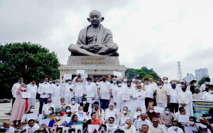 ಧರಣಿಯಲ್ಲಿ ಕೆಪಿಸಿಸಿ ಅಧ್ಯಕ್ಷ ಡಿ.ಕೆ. ಶಿವಕುಮಾರ್, ವಿಧಾನಸಭೆ ವಿರೋಧ ಪಕ್ಷದ ನಾಯಕ ಸಿದ್ದರಾಮಯ್ಯ, ವಿಧಾನ ಪರಿಷತ್ ಪ್ರತಿಪಕ್ಷ ನಾಯಕ ಎಸ್.ಆರ್. ಪಾಟೀಲ್, ಮುಖಂಡರಾದ ಎಚ್.ಕೆ. ಪಾಟೀಲ್, ಅಲ್ಲಂ ವೀರಭದ್ರಪ್ಪ, ರಾಮಲಿಂಗಾರೆಡ್ಡಿ, ಕೆ.ಆರ್. ರಮೇಶ್ ಕುಮಾರ್, ಶಿವಾನಂದ ಪಾಟೀಲ್, ಶಿವಶಂಕರರೆಡ್ಡಿ, ಕೃಷ್ಣಬೈರೇಗೌಡ, ಪ್ರಿಯಾಂಕ್ ಖರ್ಗೆ, ಸಲೀಂ ಅಹಮದ್, ಅಜಯ್ ಸಿಂಗ್, ನಾರಾಯಣಸ್ವಾಮಿ, ಎಸ್. ರವಿ ಮತ್ತಿತರರು ಭಾಗವಹಿಸಿದ್ದರು.