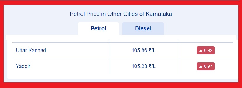 ರಾಜ್ಯದಲ್ಲೇ ಪೆಟ್ರೋಲ್ ಮತ್ತು ಡೀಸೆಲ್ ಬೆಲೆಯ ಹಚ್ಚಿರುವ ಜಿಲ್ಲೆಯಾಗಿ ಶಿವಮೊಗ್ಗ ಹೊರಹೊಮ್ಮಿದೆ. ಅಲ್ಲಿ ಪೆಟ್ರೋಲ್ ದರ 106.27 ರೂ.ಗೆ ತಲುಪಿದ್ದು, ಡೀಸೆಲ್ ದರ 90.22 ರೂ. ಗೆ ತಲುಪಿದೆ.