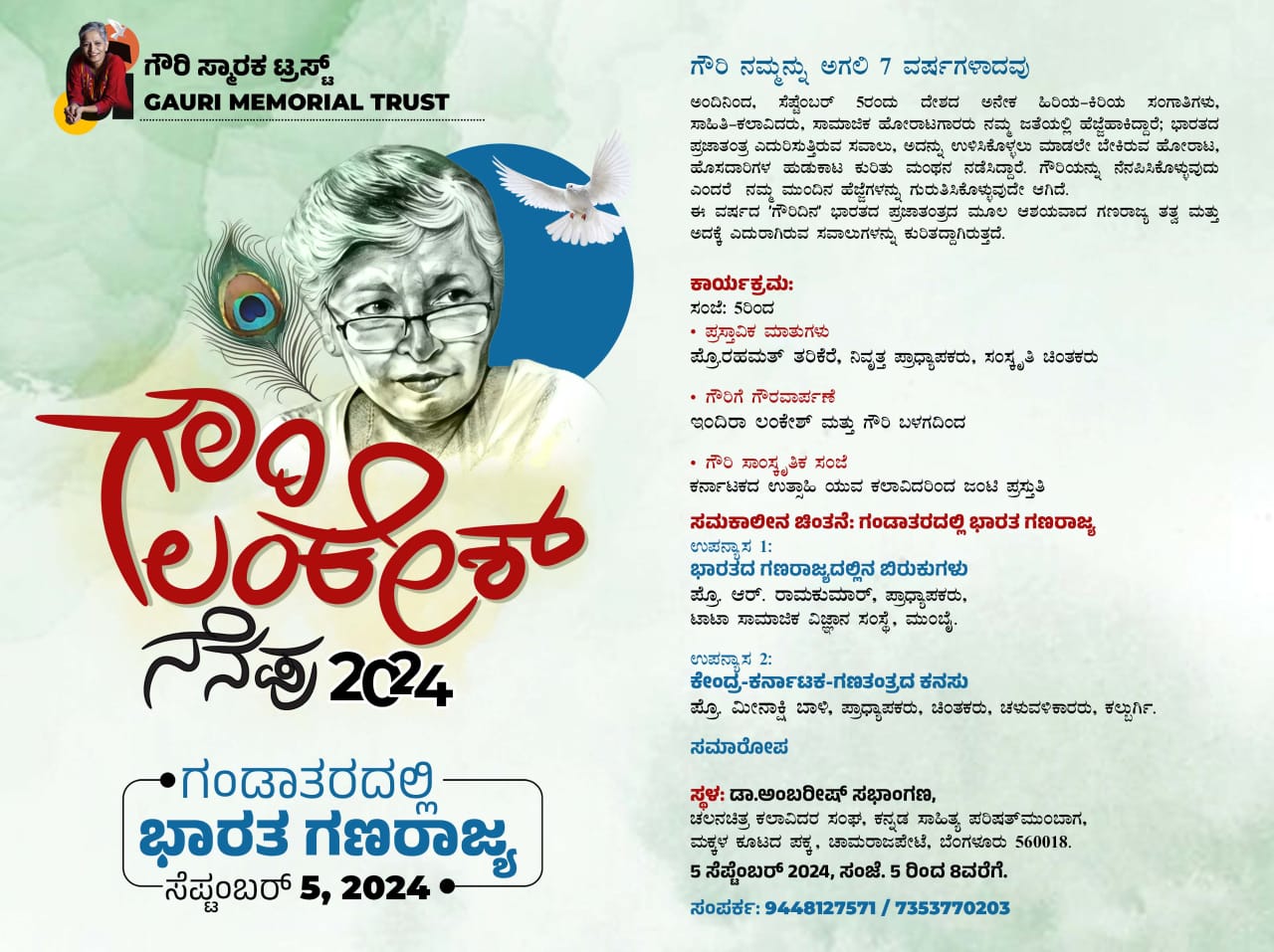 ಇಂದು ಸಂಜೆ ಗೌರಿ ಲಂಕೇಶ್ ಅವರ ನೆನಪಿನಲ್ಲಿ ‘ಗಂಡಾಂತರದಲ್ಲಿ ಭಾರತ ಗಣರಾಜ್ಯ‘ ಎಂಬ ಕಾರ್ಯಕ್ರಮ ಬೆಂಗಳೂರಿನ ಚಾಮರಾಜಪೇಟೆಯ ಚಲನಚಿತ್ರ ಕಲಾವಿದರ ಸಂಘದ ಡಾ.ಅಂಬರೀಷ್ ಸಭಾಂಗಣದಲ್ಲಿ ನಡೆಯಲಿದೆ. ಹಲವು ಗಣ್ಯರು ಭಾಗವಹಿಸಲಿದ್ದಾರೆ.