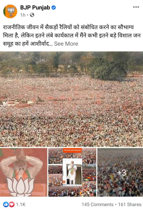 ಪಶ್ಚಿಮ ಬಂಗಾಳ ವಿಧಾನಸಭಾ ಚುನಾವಣೆಯ ಪ್ರಚಾರದಲ್ಲಿ ಪ್ರಧಾನಿ ಮೋದಿ ಅವರು ಕೋಲ್ಕತ್ತಾದ ಬ್ರಿಗೇಡ್ ಪೆರೇಡ್ ಮೈದಾನದಲ್ಲಿ ತಮ್ಮ ಮೊದಲ ರ್ಯಾಲಿಯಲ್ಲಿ ಭಾನುವಾರ ಮಾತನಾಡಿದರು. ಆದರೆ ರ್ಯಾಲಿಗೆ ನಿರೀಕ್ಷಿತ ಸಂಖ್ಯೆಯಲ್ಲಿ ಜನರು ಭಾಗವಹಿಸಿರಲಿಲ್ಲ ಎಂದು ಕೆಲ ಮಾಧ್ಯಮಗಳು ವರದಿ ಮಾಡಿದ್ದವು. ಆದರೆ ಸಾಮಾಜಿಕ ಮಾಧ್ಯಮಗಳಲ್ಲಿ ಮಾತ್ರ ಭಾರೀ ಜನ ಸೇರಿರುವುದಾಗಿ ಹಲವು ಫೋಟೊಗಳು ಹರಿದಾಡತೊಡಗಿದವು. ಆ ಚಿತ್ರಗಳು ಯಾವುವು ಎಂಬುದನ್ನು ಪರಿಶೀಲಿಸೋಣ.