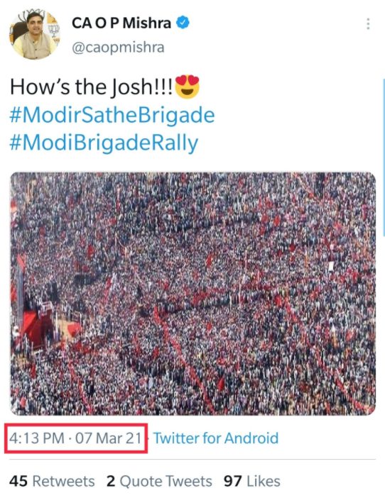 ಫೇಕ್ ನ್ಯೂಸ್ ಹೆಚ್ಚಳವು ಚುನಾವಣೆಗಳ ಮೊದಲು ಕಂಡುಬರುವುದು ಸಾಮಾನ್ಯ, ಪಶ್ಚಿಮ ಬಂಗಾಳ ವಿಧಾನಸಭಾ ಚುನಾವಣೆಗಳು ಇದಕ್ಕೆ ಹೊರತಾಗಿಲ್ಲ. ಬ್ರಿಗೇಡ್ ಪೆರೇಡ್ ಮೈದಾನದಲ್ಲಿ ಪಿಎಂ ಮೋದಿಯವರ ಭಾಷಣಕ್ಕೆ ಹೆಚ್ಚಿನ ಜನಸಮೂಹ ಸೇರದಿರುವುದು ಗಮನಾರ್ಹವಾಗಿದೆ. ಮೂರು ರೈಲು ಬಾಡಿಗೆ ಪಡೆದು ಜನರನ್ನು ತಂದರೂ ಅಲ್ಲಿ ದೊಡ್ಡ ಜನಸಂದಣಿ ಇರಲೇ ಇಲ್ಲ.