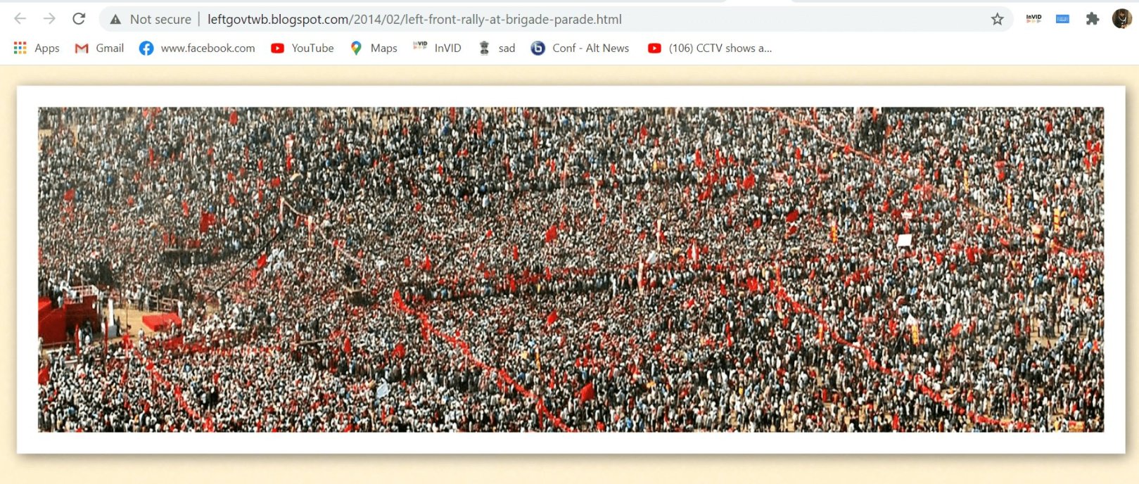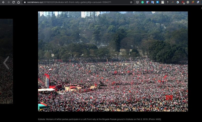 ಈ ಚಿತ್ರವನ್ನು 2019 ರಲ್ಲಿ ಸೋಷಿಯಲ್ ನ್ಯೂಸ್ XYZ ಪ್ರಕಟಿಸಿತು, ಇದು ಕೊಲ್ಕತ್ತಾದ ಬ್ರಿಗೇಡ್ ಪೆರೇಡ್ ಮೈದಾನದಲ್ಲಿ ಎಡರಂಗ ನೇತೃತ್ವದಲ್ಲಿ ನಡೆದ ರ್ಯಾಲಿಯ ಚಿತ್ರ ಎಂಬುದು ಸ್ಪಷ್ಟವಾಗಿದೆ. ಹಾಗೆಯೇ ಶೀರ್ಷಿಕೆಯೊಂದಿಗೆ ಅದು ಪ್ರಕಟಿಸಿದೆ. ಫೆಬ್ರವರಿ 3, 2019ರಂದು ನಡೆದ ಈ ರ್ಯಾಲಿಯ ಚಿತ್ರವನ್ನು ಐಎಎನ್ಎಸ್ ಪ್ರಕಟಿಸಿದೆ ಎಂದು ವರದಿ ಹೇಳುತ್ತದೆ.