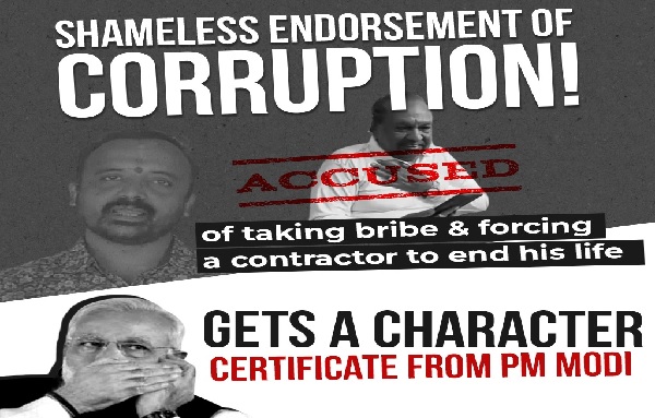 ”ಒಂದು ಕಡೆ ಈಶ್ವರಪ್ಪ ಮೇಲೆ ಕಮಿಷನ್ ಆರೋಪ. ಡೆತ್ ನೋಟ್ ಬರೆದಿಟ್ಟು ಗುತ್ತಿಗೆದಾರ ಸಂತೋಷ್ ಪಾಟೀಲ್ ಆತ್ಮಹತ್ಯೆ. ಇನ್ನೊಂದೆಡೆ ಸ್ವತಃ ಕರೆ ಮಾಡಿ ಈಶ್ವರಪ್ಪರನ್ನು ಶ್ಲಾಘಿಸಿದ ಪ್ರಧಾನಿ ಮೋದಿ. ಪ್ರಧಾನಿ ಮೋದಿ ‘ಭ್ರಷ್ಟಾಚಾರ’ದ ಪರ ನಿಂತಿದ್ದಾರೆ ಎನ್ನುವುದಕ್ಕೆ ಇದಕ್ಕಿಂದ ಸಾಕ್ಷಿ ಬೇಕೆ?” ಎಂದು ಕಾಂಗ್ರೆಸ್ ಪ್ರಶ್ನೆ ಮಾಡಿದೆ.