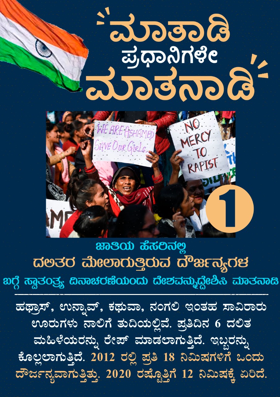 ದೆಹಲಿಯ ದಲಿತ ಕಂದಮ್ಮಳೊಬ್ಬಳನ್ನು ಕಾಮಪಿಶಾಚಿ ಪೂಜಾರಿಯೊಬ್ಬ ಬರ್ಬರವಾಗಿ ಅತ್ಯಾಚಾರಗೈದು ಕೊಂದು ಸುಟ್ಟು ಹಾಕಿದ ಸುದ್ದಿ ಕೇಳಿದಾಗಿನಿಂದ ನಾವು ಆಘಾತಕ್ಕೊಳಗಾಗಿದ್ದೇವೆ. ಇಂತಹ ಅಮಾನುಷ ಘಟನೆಗಳಿಗೆ ಕೊನೆಯೆಂದು? ದಲಿತರೊಟ್ಟಿಗೆ ಅಲ್ಪಸಂಖ್ಯಾತ- ಮಹಿಳೆ- ಕಾರ್ಮಿಕ-ರೈತ ಸೇರಿದಂತೆ ನಾಡಿನ ಜನತೆ ಎಲ್ಲಾ ರೀತಿಯಿಂದಲೂ ತೀವ್ರ ಸಂಕಷ್ಟಕ್ಕೀಡಾಗಿರುವುದು ನಮ್ಮನ್ನು ಚಿಂತಿತರನ್ನಾಗಿ ಮಾಡಿದೆ ಇದಕ್ಕೆ ಏನು ಮಾಡುತ್ತೀರಿ ಎಂದು ಮಾತನಾಡಿ ಎಂದು ಒತ್ತಾಯಿಸಿದ್ದಾರೆ.