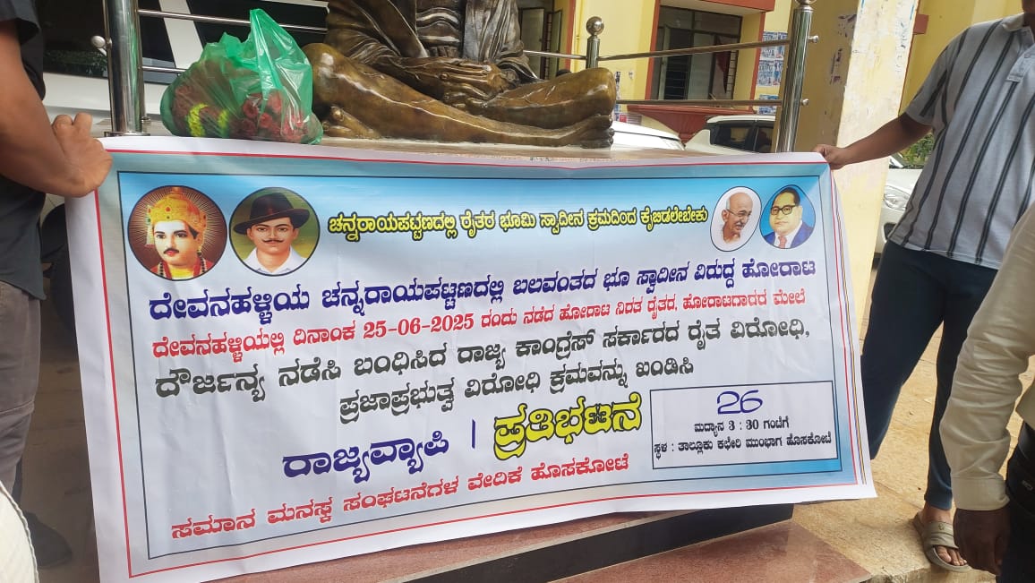 ಬೆಂಗಳೂರು ಗ್ರಾಮಾಂತರ ಜಿಲ್ಲೆಯ ದೇವನಹಳ್ಳಿ ತಾಲೂಕಿನ ಚನ್ನರಾಯಪಟ್ಟಣ ಹೋಬಳಿಯ 13 ಹಳ್ಳಿಗಳ 1777 ಎಕರೆ ಫಲವತ್ತಾದ ಕೃಷಿ ಭೂಮಿಯನ್ನು ಕೈಗಾರಿಕೆ ಸ್ಥಾಪನೆಗಾಗಿ ಸ್ವಾಧೀನಕ್ಕೆ ತೆಗೆದುಕೊಳ್ಳಲು ಮುಂದಾಗಿರುವ ಸರ್ಕಾರದ ನಿರ್ಧಾರ ವಿರೋಧಿಸಿ ಮೂರೂವರೆ ವರ್ಷಗಳಿಂದ ರೈತರು ಹೋರಾಟ ನಡೆಸಿತ್ತಿದ್ದಾರೆ. ಚನ್ನರಾಯಪಟ್ಟಣ ಭೂಸ್ವಾಧೀನ ವಿರೋಧಿ ಹೋರಾಟ ಸಮಿತಿ ಮತ್ತು ಕೆಐಎಡಿಬಿ ನಡುವಿನ ಸಂಘರ್ಷ ನಿರ್ಣಾಯ ಹಂತಕ್ಕೆ ತಲುಪಿದ್ದು, ಸಂಯುಕ್ತ ಹೋರಾಟ-ಕರ್ನಾಟಕ ಸಂಘಟನೆ ಬುಧವಾರ (ಜೂ.25) ದೇವನಹಳ್ಳಿ ಚಲೋ ಹೋರಾಟಕ್ಕೆ ಕರೆ ನೀಡಿತ್ತು.