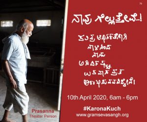 ಕೊರೊನಾ ಆವರಿಸುತ್ತಿದೆ. ಆರ್ಥಿಕತೆ ಪಾತಾಳಕ್ಕೆ ಕುಸಿದಿದೆ. ವಲಸೆ ಕಾರ್ಮಿಕರು ಹಸಿವಿನಿಂದಿದ್ದಾರೆ. ಇಂತಹ ಸಮಯದಲ್ಲಿ ಗುಳೆ ಎದ್ದಿರುವ ಬಡವರ ಕಷ್ಟನಷ್ಟಗಳಿಗೆ ಸ್ಪಂದಿಸುವ ಹಾಗೂ ಆತ್ಮವಿಮರ್ಶೆಮಾಡಿಕೊಳ್ಳುವ ಸಲುವಾಗಿ ಹಿರಿಯ ರಂಗಕರ್ಮಿ, ಹೋರಾಟಗಾರ ಮತ್ತು ಚಿಂತಕರಾದ ಹೆಗ್ಗೋಡು ಪ್ರಸನ್ನರವರು ಅನಿರ್ದಿಷ್ಟ ಅವಧಿಯ ಉಪವಾಸ ಸತ್ಯಾಗ್ರಹ ಆರಂಭಿಸಿದ್ದಾರೆ.