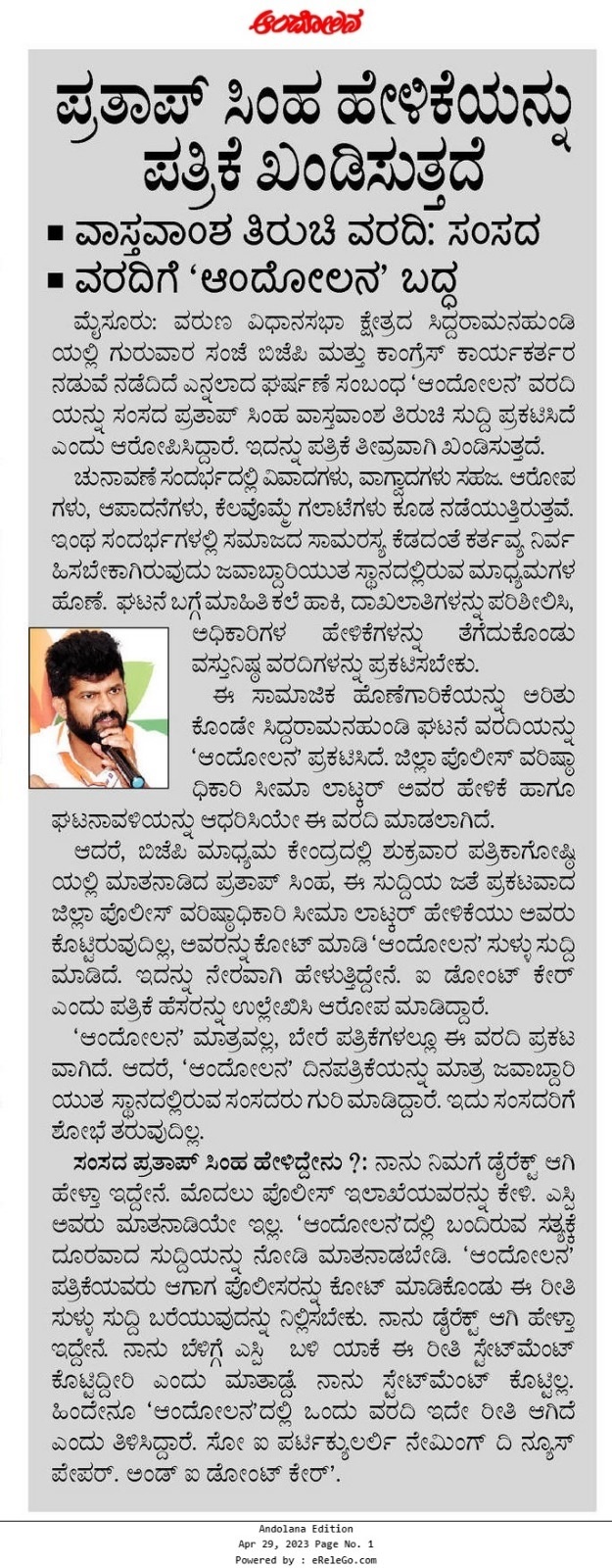 “ಆದರೆ, ಬಿಜೆಪಿ ಮಾಧ್ಯಮ ಕೇಂದ್ರದಲ್ಲಿ ಶುಕ್ರವಾರ ಪತ್ರಿಕಾಗೋಷ್ಠಿಯಲ್ಲಿ ಮಾತನಾಡಿದ ಪ್ರತಾಪ್ ಸಿಂಹ, ಈ ಸುದ್ದಿಯ ಜತೆ ಪ್ರಕಟವಾದ ಜಿಲ್ಲಾ ಪೊಲೀಸ್ ವರಿಷ್ಠಾಧಿಕಾರಿ ಸೀಮಾ ಲಾಟ್ಕರ್ ಹೇಳಿಕೆಯು ಅವರು ಕೊಟ್ಟಿರುವುದಿಲ್ಲ, ಅವರನ್ನು ಕೋಟ್ ಮಾಡಿ ‘ಆಂದೋಲನ’ ಸುಳ್ಳು ಸುದ್ದಿ ಮಾಡಿದೆ. ಇದನ್ನು ನೇರವಾಗಿ ಹೇಳುತ್ತಿದ್ದೇನೆ. ಐ ಡೋಂಟ್ ಕೇರ್ ಎಂದು ಪತ್ರಿಕೆಯ ಹೆಸರನ್ನು ಉಲ್ಲೇಖಿಸಿ ಆರೋಪ ಮಾಡಿದ್ದಾರೆ.”