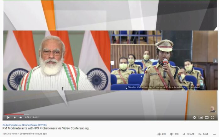 ಹೈದರಾಬಾದ್‌ನ ಸರ್ದಾರ್‌ ವಲ್ಲಭಭಾಯಿ ಪಟೇಲ್ ರಾಷ್ಟ್ರೀಯ ಪೊಲೀಸ್ ಅಕಾಡೆಮಿಯ ಐಪಿಎಸ್‌ ಪ್ರೊಬೇಷನರಿ ಅಧಿಕಾರಿಗಳೊಂದಿಗೆ ಶುಕ್ರವಾರ(ಸೆ.4) ಪ್ರಧಾನಿ ಮೋದಿ ವಿಡಿಯೊ ಸಂವಾದ ನಡೆಸಿದರು.
