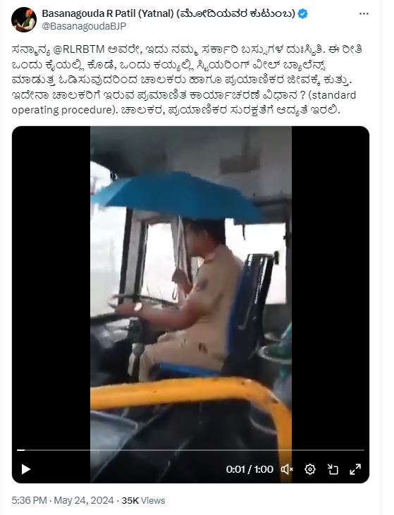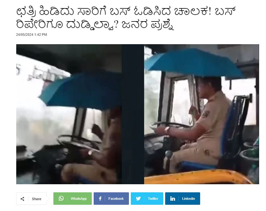 ವಾಯುವ್ಯ ಕರ್ನಾಟಕ ರಾಜ್ಯ ರಸ್ತೆ ಸಾರಿಗೆ ನಿಗಮ (ಎನ್ಡಬ್ಲ್ಯುಕೆಆರ್ಟಿಸಿ)ದ ಚಾಲಕ ಕೊಡೆ ಹಿಡಿದು ಬಸ್ ಚಾಲನೆ ಮಾಡಿದ ವಿಡಿಯೋವೊಂದು ಮೇ 24, 2024ರಂದು ಸಾಮಾಜಿಕ ಜಾಲತಾಣಗಳಲ್ಲಿ ವೈರಲ್ ಆಗಿತ್ತು.