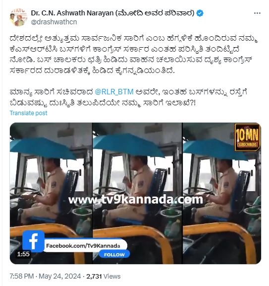 ವಿಡಿಯೋ ವೈರಲ್ ಆಗುತ್ತಿದ್ದಂತೆ ಮೇ 24, 2024ರಂದು ಎಕ್ಸ್ ಮೂಲಕ ಪ್ರತಿಕ್ರಿಯೆ ಕೊಟ್ಟಿರುವ ಸಾರಿಗೆ ಸಚಿವ ರಾಮಲಿಂಗಾ ರೆಡ್ಡಿ ಅವರು, “ಮಳೆ ಬರುತ್ತಿರುವಾಗ ಸಂಸ್ಥೆಯ ವಾಹನದ ಚಾಲಕರು ಕೊಡೆ ಹಿಡಿದುಕೊಂಡು ಚಾಲನೆ ಮಾಡುವ ವಿಡಿಯೋ (ಮನರಂಜನೆಗಾಗಿ ಮಾಡಿದ ವಿಡಿಯೋ ಕುರಿತು) ಬಿಜೆಪಿಯವರು ಟ್ವೀಟ್ ಮಾಡಿ ಮಾಡಿ ಉತ್ತರಕುಮಾರನ ಪೌರುಷವನ್ನು ತೋರಿಸುತ್ತಿರುವುದಕ್ಕೆ ಹಾಗೂ ಅವರ ಈ ಸಂತೋಷಕ್ಕೆ ಕಡಿವಾಣ ಹಾಕಬೇಕಾಗಿದೆಯಲ್ಲ ಎಂಬ ನೋವಿನೊಂದಿಗೆ ಈ ವಿವರಣೆ ನೀಡಲಾಗುತ್ತಿದೆ.