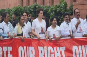 ಬಿಹಾರದಲ್ಲಿ ಮತದಾರರ ಪಟ್ಟಿಯ ವಿಶೇಷ ತೀವ್ರ ಪರಿಷ್ಕರಣೆ (ಎಸ್ಐಆರ್) ವಿರೋಧಿಸಿ ಮತ್ತು 2024ರ ಲೋಕಸಭೆ ಚುನಾವಣೆಯಲ್ಲಿ ಮತಗಳ್ಳತನ ನಡೆದಿದೆ ಎಂದು ಆರೋಪಿಸಿ ಪ್ರತಿಪಕ್ಷ ಸಂಸದರು ಮಂಗಳವಾರವೂ (ಆ.12) ಸಂಸತ್ತಿನ ಮುಂದೆ ಪ್ರತಿಭಟನೆ ನಡೆಸಿದರು. ಪ್ರತಿಭಟನೆಯ ವೇಳೆ ಕಾಂಗ್ರೆಸ್ ನಾಯಕಿ, ಸಂಸದೆ ಪ್ರಿಯಾಂಕಾ ಗಾಂಧಿ, ದಾವಣಗೆರೆ ಕಾಂಗ್ರೆಸ್ ಸಂಸದೆ ಪ್ರಭಾ ಮಲ್ಲಿಕಾರ್ಜುನ್ ಸೇರಿದಂತೆ ಹಲವರು ‘ಮಿಂಟಾ ದೇವಿ’ ಎಂದು ಬರೆದ ಮಹಿಳೆಯೊಬ್ಬರ ಚಿತ್ರವಿರುವ ಟೀ- ಶರ್ಟ್ ಧರಿಸಿ ಗಮನ ಸೆಳೆದರು. ಟೀ-ಶರ್ಟ್ ಹಿಂಭಾಗದಲ್ಲಿ ‘124 ನಾಟ್ ಔಟ್’ ಎಂದು … Continue reading ಬಿಹಾರ ಎಸ್ಐಆರ್, ಮತಗಳ್ಳತನದ ವಿರುದ್ಧ ಸಂಸತ್ ಮುಂದೆ ಪ್ರತಿಭಟನೆ: ವಿಶೇಷ ಟೀ-ಶರ್ಟ್ ಧರಿಸಿ ಗಮನಸೆಳೆದ ಪ್ರತಿಪಕ್ಷ ಸಂಸದರು