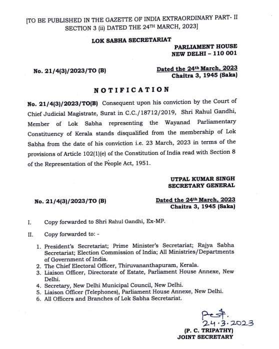 ಲೋಕಸಭಾ ಸೆಕ್ರೆಟರಿಯೇಟ್ರವರು ಈ ಕುರಿತು ಪ್ರಕಟಣೆ ಹೊರಡಿಸಿದ್ದು, “ಕೇರಳದ ವಯನಾಡ್ ಸಂಸದೀಯ ಕ್ಷೇತ್ರವನ್ನು ಪ್ರತಿನಿಧಿಸುವ ಲೋಕಸಭಾ ಸದಸ್ಯರಾದ ಶ್ರೀ ರಾಹುಲ್ ಗಾಂಧಿಯವರನ್ನು ಸೂರತ್ನ ಮುಖ್ಯ ಜುಡಿಷಿಯಲ್ ಮ್ಯಾಜಿಸ್ಟ್ರೇಟ್ ನ್ಯಾಯಾಲಯವು ಅಪರಾಧಿ ಎಂದು ಘೋಷಿಸಿದ ನಂತರ, 1951ರ ಪ್ರಜಾಪ್ರತಿನಿಧಿ ಕಾಯ್ದೆಯ 8ನೇ ಪರಿಚ್ಛೇದದೊಂದಿಗೆ, ಭಾರತದ ಸಂವಿಧಾನದ 102(1)(ಇ) ವಿಧಿಯ ನಿಬಂಧನೆಗಳ ಪ್ರಕಾರ, ಮಾರ್ಚ್ 23, 2023 ರಿಂದ (ಶಿಕ್ಷೆಯಾದ ದಿನಾಂಕದಿಂದ) ಅವರು ಲೋಕಸಭೆಯ ಸದಸ್ಯತ್ವದಿಂದ ಅನರ್ಹಗೊಂಡಿದ್ದಾರೆ” ಎಂದು ಆದೇಶಿಸಲಾಗಿದೆ.
