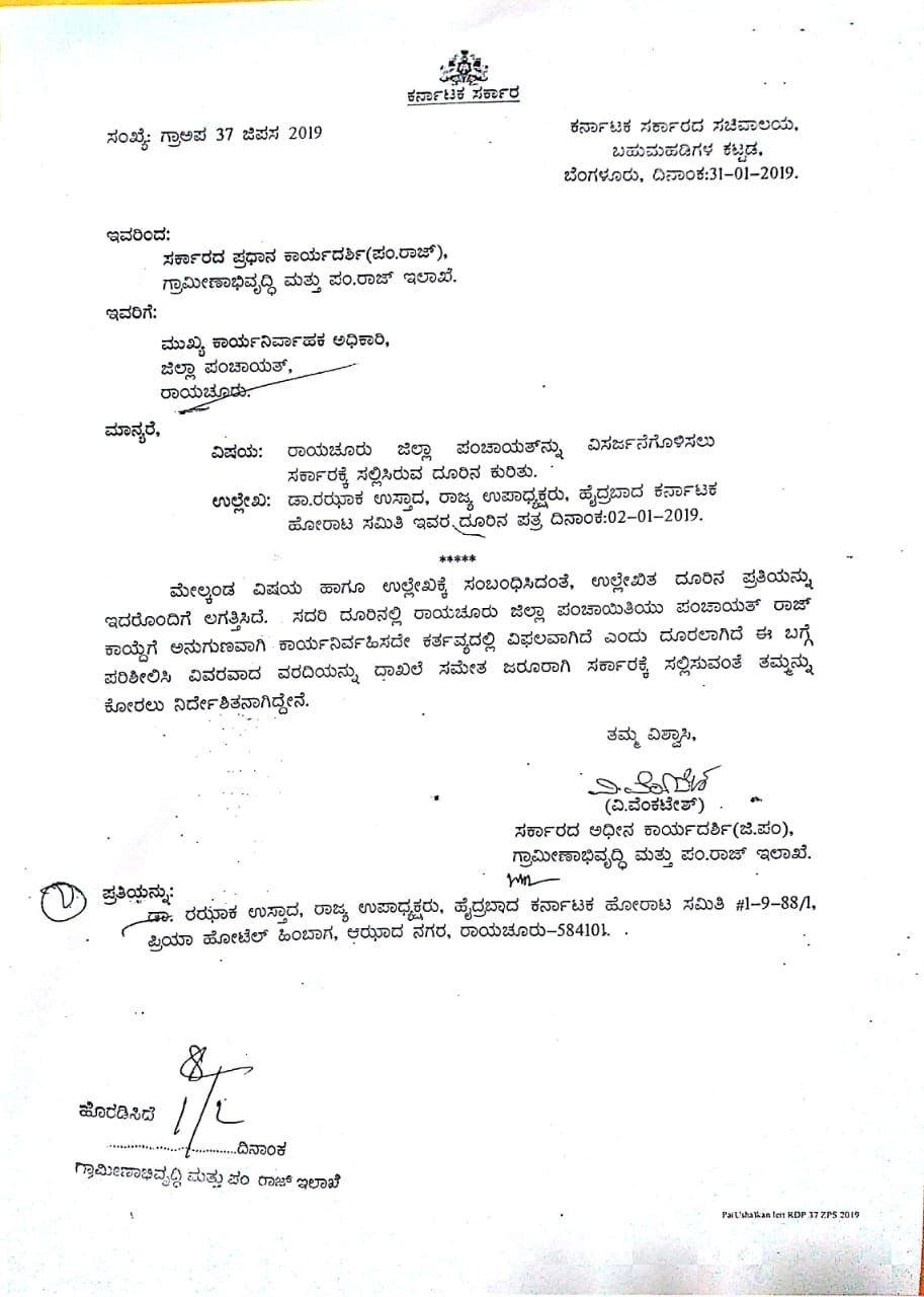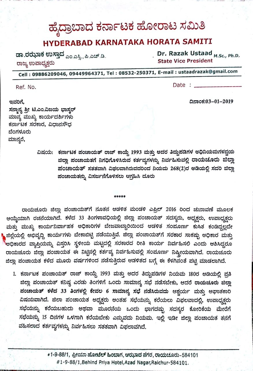ಪಂಚಾಯತ್ ರಾಜ್ ಅಧಿನಿಯಮ 1993 ರ 268/2 ರ ಅನ್ವಯ ಯಾವುದೇ ಪಂಚಾಯ್ತಿ ಸತತವಾಗಿ ತನ್ನ ಕರ್ತವ್ಯಗಳನ್ನು ನಿರ್ವಹಿಸುವಲ್ಲಿ ವಿಫಲವಾದಲ್ಲಿ ಅಂತಹ ಪಂಚಾಯ್ತಿಯನ್ನು ವಿಸರ್ಜನೆಗೊಳಿಸಿ ಮರುಚುನಾವಣೆ ನಡೆಸಬೇಕು ಎಂಬ ನಿಯಮವಿದೆ. ಇದರನ್ವಯ 2019ರ ಜನವರಿಯಲ್ಲಿ ಡಾ. ರಝಾಕ್ ಉಸ್ತಾದ್ರವರು ಸರ್ಕಾರಕ್ಕೆ ದೂರು ನೀಡಿ ಪಂಚಾಯ್ತಿ ವಿಸರ್ಜಿಸಲು ಆಗ್ರಹಿಸಿದ್ದರು. ಆಗಿನ ಪಂಚಾಯತ್ ರಾಜ್ ಮತ್ತು ಗ್ರಾಮೀಣ ಅಭಿವೃದ್ಧಿ ಸಚಿವರಾದ ಕೃಷ್ಣಭೈರೇಗೌಡರು ಅದನ್ನು ಪರಿಶೀಲಿಸಿ ವಿಸರ್ಜನೆಗೆ ಶಿಫಾರಸ್ಸು ಸಹ ಮಾಡಿದ್ದರು. ಆದರೆ ಅಷ್ಟರಲ್ಲಿ ಜೆಡಿಎಸ್-ಕಾಂಗ್ರೆಸ್ ಸರ್ಕಾರ ಬಿದ್ದುಹೋಗಿ ಬಿಜೆಪಿ ಸರ್ಕಾರ ಅಧಿಕಾರಕ್ಕೆ ಬಂದಿತ್ತು. ಅಲ್ಲಿಗೆ ಆ ಶಿಫಾರಸ್ಸು ಮೂಲೆ ಸೇರಿತು. ಏಕೆಂದರೆ ರಾಯಚೂರು ಜಿಲ್ಲಾ ಪಂಚಾಯ್ತಿ ಅಧ್ಯಕ್ಷರು ಬಿಜೆಪಿಯವರಾಗಿರುವುದು.