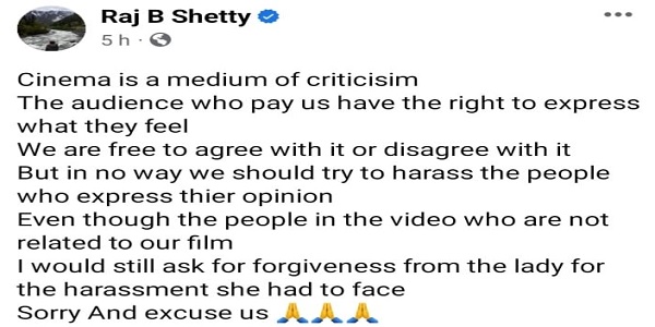 ‘ದೌರ್ಜನ್ಯಕ್ಕೀಡಾದ ಯುವತಿ ಜತೆ ಕ್ಷಮೆ ಕೇಳುತ್ತೇನೆ’ ಎಂದು ರಾಜ್ ಬಿ ಶೆಟ್ಟಿ ತಮ್ಮ ಫೇಸ್‌ಬುಕ್‌ ಖಾತೆಯಲ್ಲಿ ಬರೆದುಕೊಂಡಿದ್ದಾರೆ.