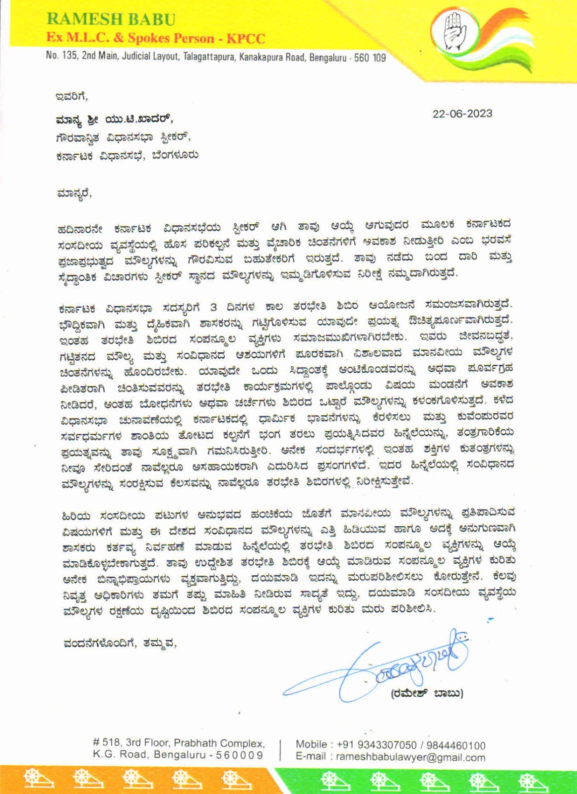 ಕರ್ನಾಟಕ ವಿಧಾನಸಭಾ ಸದಸ್ಯರಿಗೆ 3 ದಿನಗಳ ಕಾಲ ತರಬೇತಿ ಶಿಬಿರ ಆಯೋಜನೆ ಸಮಂಜಸವಾಗಿರುತ್ತದೆ. ಭೌದ್ದಿಕವಾಗಿ ಮತ್ತು ದೈಹಿಕವಾಗಿ ಶಾಸಕರನ್ನು ಗಟ್ಟಿಗೊಳಿಸುವ ಯಾವುದೇ ಪ್ರಯತ್ನ ಔಚಿತ್ಯಪೂರ್ಣವಾಗಿರುತ್ತದೆ. ಇಂತಹ ತರಭೇತಿ ಶಿಬಿರದ ಸಂಪನ್ಮೂಲ ವ್ಯಕ್ತಿಗಳು ಸಮಾಜಮುಖಿಗಳಾಗಿರಬೇಕು. ಇವರು ಜೀವನಬದ್ಧತೆ, ಗಟ್ಟಿತನದ ಮೌಲ್ಯ ಮತ್ತು ಸಂವಿಧಾನದ ಆಶಯಗಳಿಗೆ ಪೂರಕವಾಗಿ ವಿಶಾಲವಾದ ಮಾನವೀಯ ಮೌಲ್ಯಗಳ ಚಿಂತನೆಗಳನ್ನು ಹೊಂದಿರಬೇಕು. ಯಾವುದೇ ಒಂದು ಸಿದ್ಧಾಂತಕ್ಕೆ ಅಂಟಿಕೊಂಡವರನ್ನು ಅಥವಾ ಪೂರ್ವಗ್ರಹ ಪೀಡಿತರಾಗಿ ಚಿಂತಿಸುವವರನ್ನು ತರಭೇತಿ ಕಾರ್ಯಕ್ರಮಗಳಲ್ಲಿ ಪಾಲ್ಗೊಂಡು ವಿಷಯ ಮಂಡನೆಗೆ ನೀಡಿದರೆ, ಅಂತಹ ಬೋಧನೆಗಳು ಅಥವಾ ಚರ್ಚೆಗಳು ಶಿಬಿರದ ಒಟ್ಟಾರೆ ಮೌಲ್ಯಗಳನ್ನು ಕಳಂಕಗೊಳಿಸುತ್ತದೆ ಎಂದು ರಮೇಶ್ ಬಾಬುರವರು ಸ್ಪೀಕರ್ರವರಿಗೆ ಪತ್ರ ಬರೆದಿದ್ದಾರೆ.