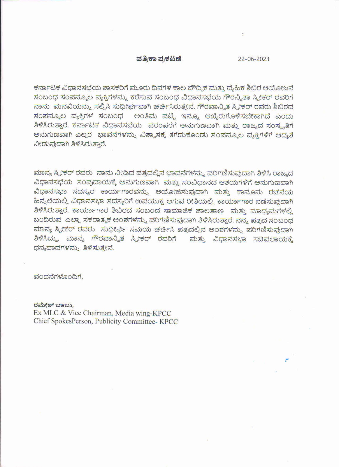 ಆನಂತರ ಮತ್ತೊಂದು ಪತ್ರಿಕಾ ಹೇಳಿಕೆ ಹೊರಡಿಸಿ, “ಸಂಪನ್ಮೂಲ ವ್ಯಕ್ತಿಗಳನ್ನು ಕರೆಸುವ ಸಂಬಂಧ ವಿಧಾನಸಭೆಯ ಗೌರವಾನ್ವಿತಾ ಸ್ಪೀಕರ್ ರವರಿಗೆ ನಾನು ಮನವಿಯನ್ನು ಸಲ್ಲಿಸಿ ಸುಧೀರ್ಘವಾಗಿ ಚರ್ಚಿಸಿರುತ್ತೇನೆ. ಗೌರವಾನ್ವಿತ ಸ್ಪೀಕರ್ ರವರು ಶಿಬಿರದ ಸಂಪನ್ಮೂಲ ವ್ಯಕ್ತಿಗಳ ಸಂಬಂಧ ಅಂತಿಮ ಪಟ್ಟಿ ಇನ್ನೂ ಆಖೈರುಗೊಳಿಸಬೇಕಾಗಿದೆ ಎಂದು ತಿಳಿಸಿರುತ್ತಾರೆ. ಕರ್ನಾಟಕ ವಿಧಾನಸಭೆಯ ಪರಂಪರೆಗೆ ಅನುಗುಣವಾಗಿ ಮತ್ತು ರಾಜ್ಯದ ಸಂಸ್ಕೃತಿಗೆ ಅನುಗುಣವಾಗಿ ಎಲ್ಲರ ಭಾವನೆಗಳನ್ನು ವಿಶ್ವಾಸಕ್ಕೆ ತೆಗೆದುಕೊಂಡು ಸಂಪನ್ಮೂಲ ವ್ಯಕ್ತಿಗಳಿಗೆ ಆದ್ಯತೆ ನೀಡುವುದಾಗಿ ತಿಳಿಸಿರುತ್ತಾರೆ. ಮಾನ್ಯ ಸ್ಪೀಕರ್ ರವರು ನಾನು ನೀಡಿದ ಪತ್ರದಲ್ಲಿನ ಭಾವನೆಗಳನ್ನು ಪರಿಗಣಿಸುವುದಾಗಿ ತಿಳಿಸಿ ರಾಜ್ಯದ ವಿಧಾನಸಭೆಯ ಸಂಪ್ರದಾಯಕ್ಕೆ ಅನುಗುಣವಾಗಿ ಮತ್ತು ಸಂವಿಧಾನದ ಆಶಯಗಳಿಗೆ ಅನುಗುಣವಾಗಿ ವಿಧಾನಸಭಾ ಸದಸ್ಯರ ಕಾರ್ಯಗಾರವನ್ನು ಆಯೋಜಿಸುವುದಾಗಿ ಮತ್ತು ಕಾನೂನು ರಚನೆಯ ಹಿನ್ನೆಲೆಯಲ್ಲಿ ವಿಧಾನಸಭಾ ಸದಸ್ಯರಿಗೆ ಉಪಯುಕ್ತ ಆಗುವ ರೀತಿಯಲ್ಲಿ ಕಾರ್ಯಾಗಾರ ನಡೆಸುವುದಾಗಿ ತಿಳಿಸಿರುತ್ತಾರೆ. ಕಾರ್ಯಾಗಾರ ಶಿಬಿರದ ಸಂಬಂಧ ಸಾಮಾಜಿಕ ಜಾಲತಾಣ ಮತ್ತು ಮಾಧ್ಯಮಗಳಲ್ಲಿ ಬಂದಿರುವ ಎಲ್ಲಾ ಸಕರಾತ್ಮಕ ಅಂಶಗಳನ್ನು ಪರಿಗಣಿಸುವುದಾಗಿ ತಿಳಿಸಿರುತ್ತಾರೆ, ನನ್ನ ಪತ್ರದ ಸಂಬಂಧ ಮಾನ್ಯ ಸ್ಪೀಕರ್ ರವರು ಸುಧೀರ್ಘ ಸಮಯ ಚರ್ಚಿಸಿ ಪತ್ರದಲ್ಲಿನ ಅಂಶಗಳನ್ನು ಪರಿಗಣಿಸುವುದಾಗಿ ತಿಳಿಸಿದ್ದು, ಮಾನ್ಯ ಗೌರವಾನ್ವಿತ ಸ್ಪೀಕರ್ ರವರಿಗೆ ಮತ್ತು ವಿಧಾನಸಭಾ ಸಚಿವಲಾಯಕ್ಕೆ ಧನ್ಯವಾದಗಳನ್ನು ತಿಳಿಸುತ್ತೇನೆ ಎಂದು ರಮೇಶ್ ಬಾಬುರವರು ತಿಳಿಸಿದ್ದಾರೆ.