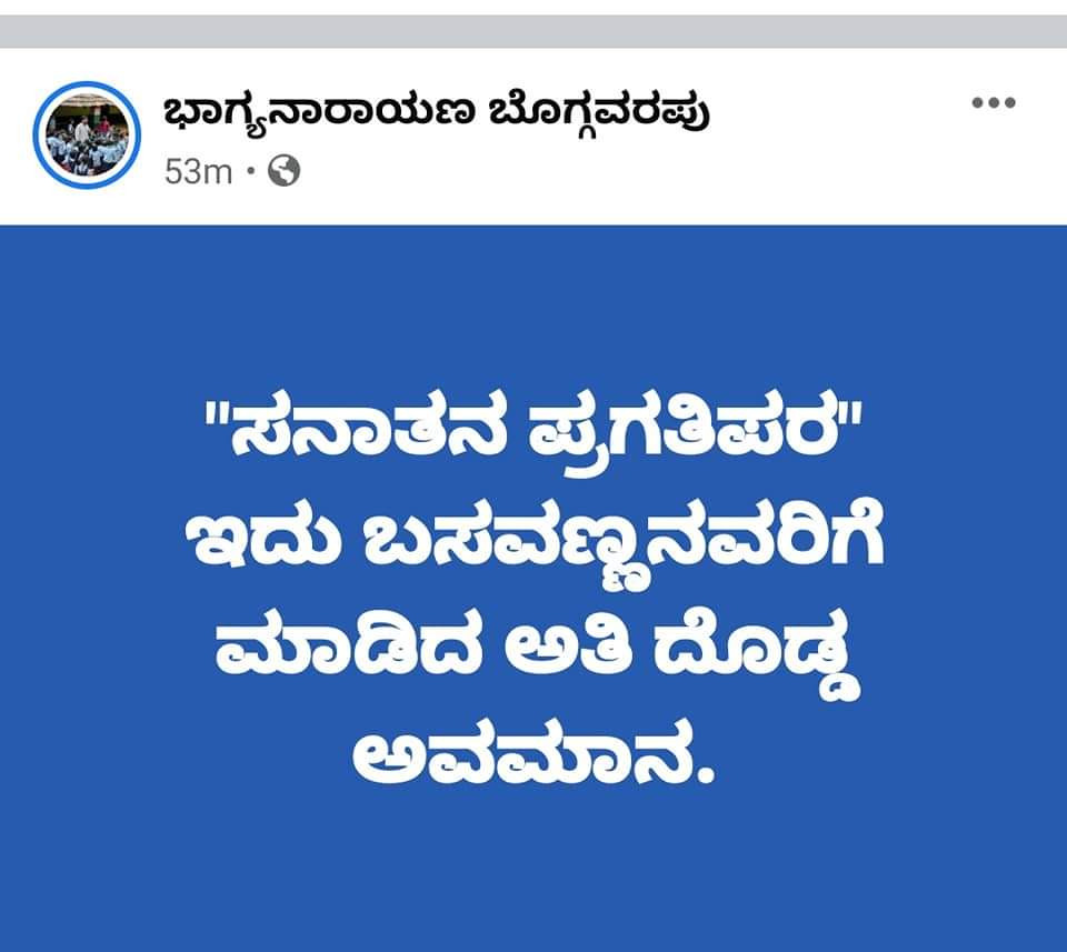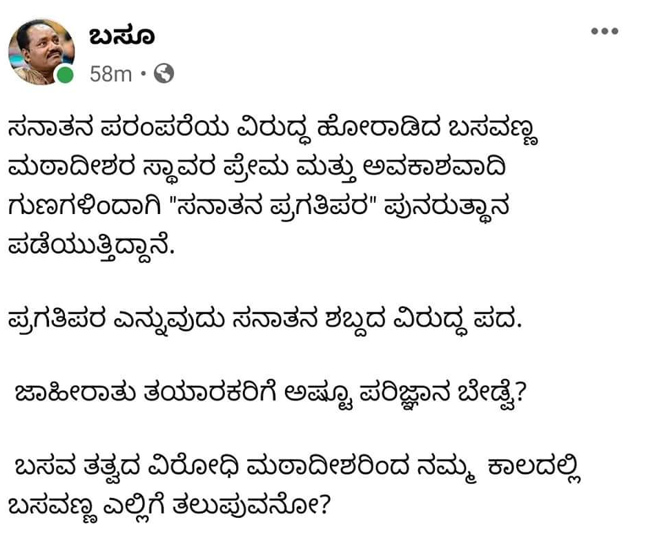 ಸನಾತನ ಮತ್ತು ವೈದಿಕತೆಯನ್ನು ಜೀವನ ಪರ್ಯಂತ ವಿರೋಧಿಸಿಕೊಂಡೇ ಬಂದಿದ್ದ ಬಸವಾದಿ ಶರಣರು, ಇದನ್ನು ತಮ್ಮ ವಚನಗಳಲ್ಲಿಯೂ ವ್ಯಕ್ತಪಡಿಸಿದ್ದರು. ಬಹುಶಃ ಬುದ್ಧನ ನಂತರ ವೈದಿಕತೆಯನ್ನು ಶರಣರಷ್ಟು ಟೀಕಿಸಿದವರು ಮತ್ತೊಬ್ಬರಿಲ್ಲ. ಇಂತಹ ಬಸವಣ್ಣನವರನ್ನು ಅಂದೇ ಇದೇ ವೈದಿಕರು ಕೊಂದಿದ್ದರು. ಆದರೆ ಇಂದು ಬಸವಣ್ಣನವರನ್ನೇ ಹೈಜಾಕ್ ಮಾಡಿ, ಅವರ ಚಿಂತನೆಯೇ ಸನಾತನ ಪ್ರಗತಿಪರ ಚಿಂತನೆ ಎಂದು ಹೇಳುತ್ತಿರುವ ಬಿಜೆಪಿ ಮತ್ತು ಯಡಿಯೂರಪ್ಪನವರ ಧೋರಣೆಯ ವಿರುದ್ಧ ರಾಜ್ಯದಾದ್ಯಂತ ಆಕ್ರೋಶ ಭುಗಿಲೆದ್ದಿದೆ.