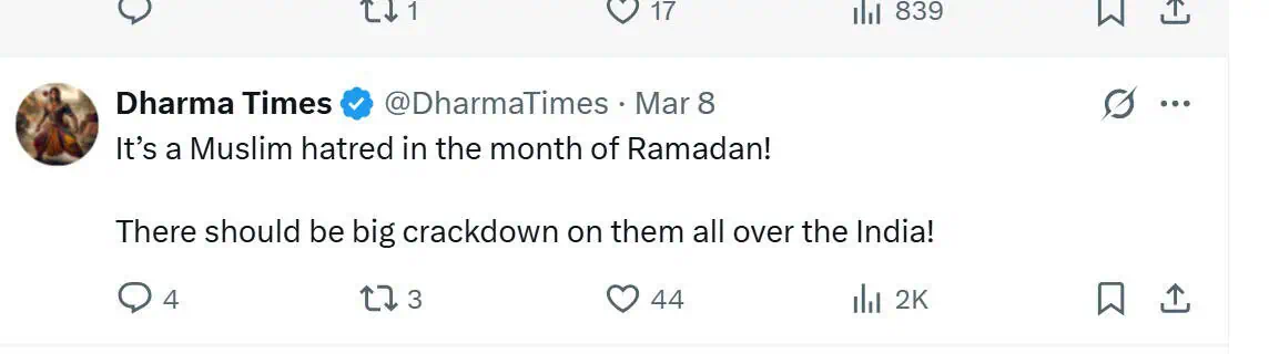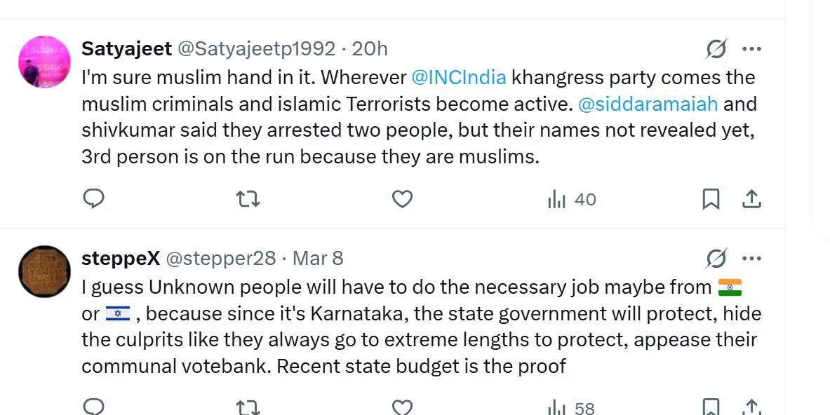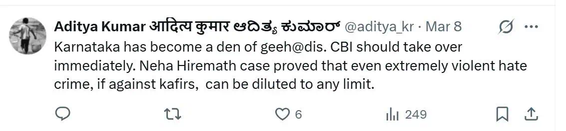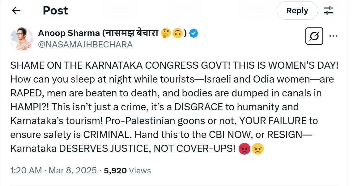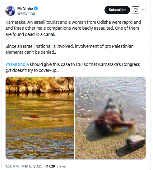 ಪ್ರತಿಯೊಂದು ವಿಷಯಗಳನ್ನು ಕೋಮು ಆಯಾಮದಿಂದ ಮಾತ್ರ ನೋಡುತ್ತಾ, ಮುಸ್ಲಿಮರನ್ನು ಅಪರಾಧಿ, ದೇಶದ್ರೋಹಿ ಸ್ಥಾನಗಳಲ್ಲಿ ನಿಲ್ಲಿಸುವ ಚಾಳಿ ಹೊಂದಿರುವ ಬಲಪಂಥೀಯ ಸಾಮಾಜಿಕಜಾಲತಾಣ ಬಳಕೆದಾರ ಮಿ. ಸಿನ್ಹಾ (@MrSinha_)ಕೊಪ್ಪಳದ ಘಟನೆ ಸಂಬಂಧ ಮಾರ್ಚ್ 8ರಂದು ಎಕ್ಸ್ನಲ್ಲಿ ಪೋಸ್ಟ್ ಹಾಕಿ “ಕರ್ನಾಟಕ: ಇಸ್ರೇಲಿ ಪ್ರವಾಸಿ ಮತ್ತು ಒಡಿಶಾದ ಮಹಿಳೆಯ ಮೇಲೆ ಅತ್ಯಾಚಾರ ಮತ್ತು ಇತರ ಮೂವರು ಪುರುಷ ಜೊತೆಗಾರರ ಮೇಲೆ ಹಲ್ಲೆ ನಡೆಸಲಾಗಿದೆ. ಅವರಲ್ಲಿ ಒಬ್ಬನ ಮೃತದೇಹ ಕಾಲುವೆಯಲ್ಲಿ ಪತ್ತೆಯಾಗಿದೆ. ಇಸ್ರೇಲಿ ಪ್ರಜೆಯೊಬ್ಬರು ಇದರಲ್ಲಿ ಬಲಿಪಶು ಆಗಿರುವುದರಿಂದ ಪ್ಯಾಲೆಸ್ತೀನ್ ಪರ ವ್ಯಕ್ತಿಗಳು ಈ ಪ್ರಕರಣದಲ್ಲಿ ಭಾಗಿಯಾಗಿರುವುದನ್ನು ನಿರಾಕರಿಸುವಂತಿಲ್ಲ.ಈ ಪ್ರಕರಣವನ್ನು ಸಿಬಿಐಗೆ ನೀಡಬೇಕು. ಈ ಮೂಲಕ ಕರ್ನಾಟಕದ ಕಾಂಗ್ರೆಸ್ ಸರ್ಕಾರ ಪ್ರಕರಣವನ್ನು ಮುಚ್ಚಿ ಹಾಕದಂತೆ ನೋಡಿಕೊಳ್ಳಬೇಕು” ಎಂದು ಬರೆದುಕೊಂಡಿದ್ದ. ತನ್ನ ಪೋಸ್ಟ್ ಅನ್ನು ಕೇಂದ್ರ ಗೃಹ ಸಚಿವಾಲಯಕ್ಕೆ ಟ್ಯಾಗ್ ಮಾಡಿದ್ದ.