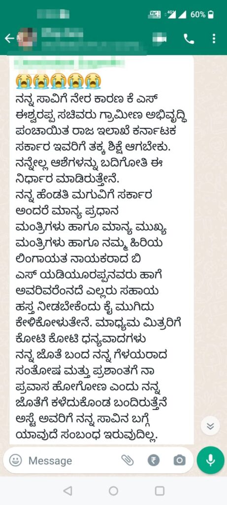 ನಿನ್ನೆ ತಡರಾತ್ರಿಯೆ ಅವರು ಆತ್ಮಹತ್ಯೆ ನೋಟ್ ಬರೆದು ಅದನ್ನು ಮಾಧ್ಯಮ ಪತ್ರಿನಿಧಿಗಳಿಗೆ ಕಳುಹಿಸಿದ್ದರು ಎಂದು ವರದಿಯಾಗಿದ್ದು, ಈ ಡೆತ್ ನೋಟ್ ಸಾಮಾಜಿಕ ಮಾಧ್ಯಮಗಳಲ್ಲಿ ಹರಿದಾಡುತ್ತಿದೆ. ಈ ಪತ್ರದಲ್ಲಿ ಅವರು ನೇರವಾಗಿಯೆ, “ನನ್ನ ಸಾವಿಗೆ ಈಶ್ವರಪ್ಪ ಕಾರಣ” ಎಂದು ಆರೋಪಿಸಿದ್ದಾರೆ.