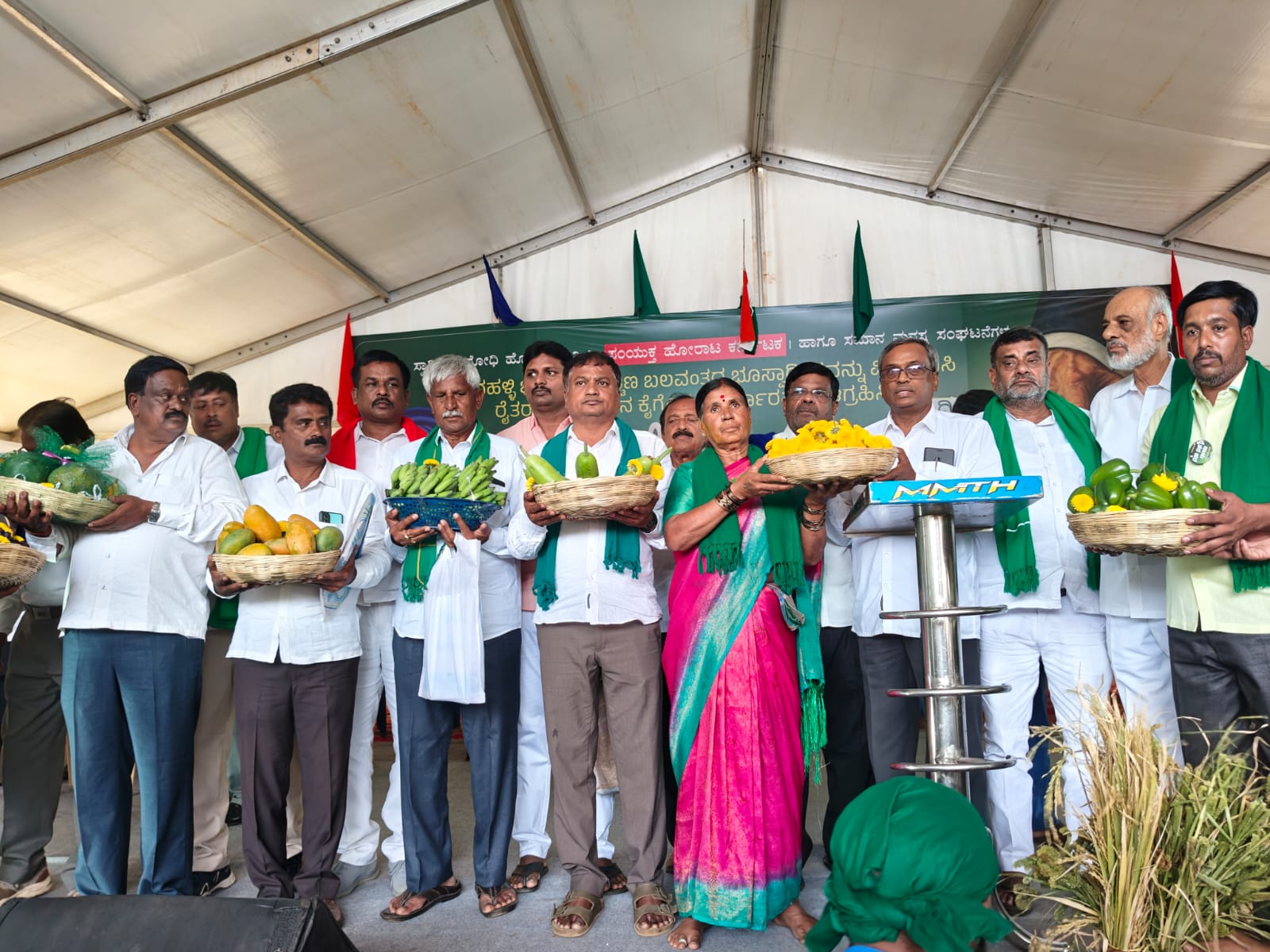 ವೇದಿಕೆಯಲ್ಲಿ ಮಾರೇಗೌಡ, ಗೋಪಿನಾಥ್, ರಮೇಶ್ ಚೀಮಾಚನಹಳ್ಳಿ, ಅಶ್ವಥ್ಥಪ್ಪ, ಪ್ರಭಾ ಬೆಳವಂಗಲ, ರಘು, ಸಂಯುಕ್ತ ಹೋರಾಟ ಕರ್ನಾಟಕದ ಪ್ರತಿನಿಧಿಗಳಾದ ಬಡಗಲಪುರ ನಾಗೇಂದ್ರ, ಎಸ್ ವರಲಕ್ಷ್ಮೀ, ನೂರ್ ಶ್ರೀಧರ್, ಎಚ್.ಆರ್.ಬಸವರಾಜಪ್ಪ, ಎಸ್ ಮೀನಾಕ್ಷಿ ಸುಂದರಂ, ಡಾ.ಸಿದ್ದನಗೌಡ ಪಾಟೀಲ್, ಗುರುಪ್ರಸಾದ್ ಕೆರಗೋಡು, ಯು ಬಸವರಾಜ, ಚುಕ್ಕಿ ನಂಜುಂಡಸ್ವಾಮಿ, ವಿ ನಾಗರಾಜ್, ಪಿ ಪಿ ಅಪ್ಪಣ್ಣ, ಡಿ.ಎಚ್.ಪೂಜಾರ್, ಕೆ.ವಿ.ಭಟ್, ಮಾವಳ್ಳಿ ಶಂಕರ್, ರಾಷ್ಟ್ರೀಯ ನಾಯಕಾರ ದರ್ಶನ್ ಪಾಲ್, ಯುದ್ವೀರ್ ಸಿಂಗ್, ರಾಕೇಶ್ ಟಿಕಾಯತ್, ಡಾ.ಸುನೀಲಮ್, ವಿಜು ಕೃಷ್ಣನ್, ಪಿ,ಟಿ.ಜಾನ್, ನಟ ಪ್ರಕಾಶ್ ರಾಜ್, ಪತ್ರಕರ್ತ ಇಂದೂಧರ ಹೊನ್ನಾಪುರ, ಚಿಂತಕ ಎಸ್.ಆರ್.ಹಿರೇಮಠ್ ಉಪಸ್ಥಿತರಿದ್ದರು.