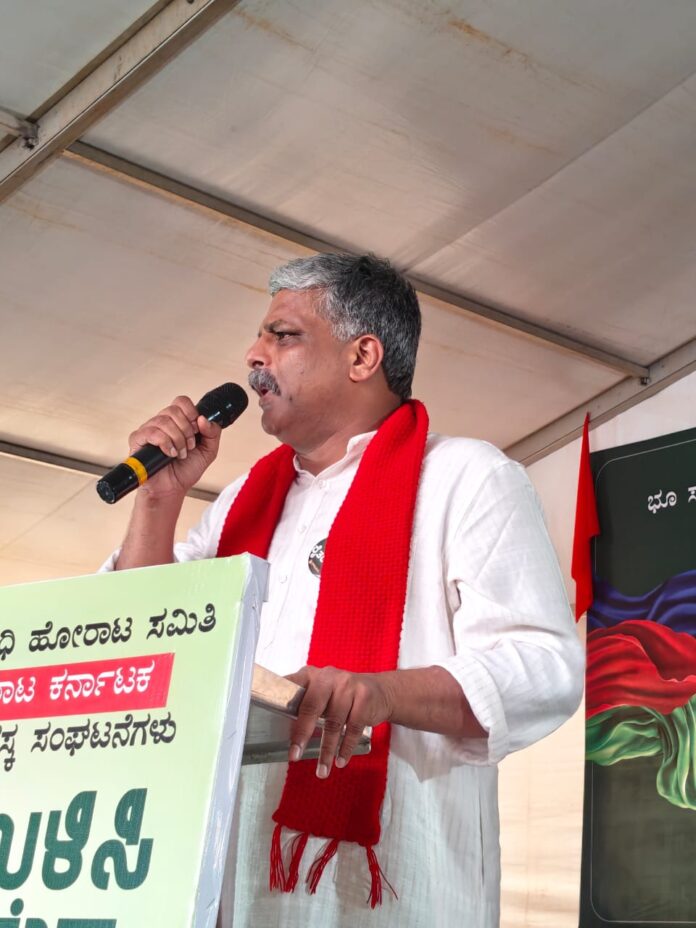 ಬೆಂಗಳೂರು: “ಚನ್ನರಾಯಪಟ್ಟಣದ ಧೀರ ಹೋರಾಟಗಾರರಿಗೆ ಸಲಾಂ! ಮೂರು ವರ್ಷಕ್ಕೂ ಹೆಚ್ಚು ಸಮಯದಿಂದ ನಡೆಯುತ್ತಿರುವ ಈ ಹೋರಾಟ ಇಡೀ ಭಾರತದ ರೈತರಿಗೆ ಹೊಸ ಹುಮ್ಮಸ್ಸು ತುಂಬುವ ಹೋರಾಟ,” ಎಂದು ಅಖಿಲ ಭಾರತ ಕಿಸಾನ್ ಸಭಾ (AIKS) ಜಂಟಿ ಕಾರ್ಯದರ್ಶಿ ಡಾ. ವಿಜು ಕೃಷ್ಣನ್ ದೇವನಹಳ್ಳಿ ಭೂ ಹೋರಾಟಗಾರರನ್ನು ಶ್ಲಾಘಿಸಿದರು. ಇಂದು (ಜುಲೈ 4) ಬೆಂಗಳೂರಿನ ಫ್ರೀಡಂ ಪಾರ್ಕ್ನಲ್ಲಿ ನಡೆದ **’ನಾಡ ಉಳಿಸಿ ಸಮಾವೇಶ’**ದಲ್ಲಿ ಮಾತನಾಡಿದ ಅವರು, ದೇಶದಲ್ಲಿ ನಡೆಯುತ್ತಿರುವ ಇತರೆ ಭೂ ಹೋರಾಟಗಳಿಗಿಂತ ದೇವನಹಳ್ಳಿ ರೈತರ ಪ್ರತಿಭಟನೆ ಹೇಗೆ ಭಿನ್ನ ಮತ್ತು ಮಹತ್ವದ್ದು ಎಂಬುದನ್ನು ವಿವರಿಸಿದರು.
