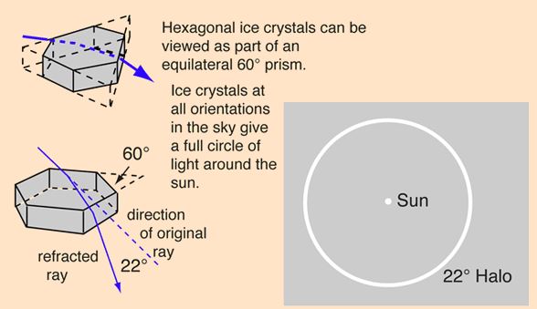 ಹಾಗೆಯೇ, ಷಡ್ಬುಜ ಆಕಾರದ ಮಂಜುಗಡ್ಡೆ ಹರಳುಗಳಿಂದ ಹಾದು ಬರುವ ಸೂರ್ಯನ ಕಿರಣಗಳು 22 ಡಿಗ್ರಿಯಲ್ಲಿ ವಕ್ರೀಭವನಗೊಂಡು ಏಳು ಬಣ್ಣಗಳಾಗಿ (VIBGYOR) ವಿಂಗಡನೆಯಾಗುತ್ತವೆ. ಅಲ್ಲದೆ, ಈ ಬಣ್ಣದ ಉಂಗುರವು ಸೂರ್ಯ ಕೇಂದ್ರದಲ್ಲಿರುವಂತೆ 22 ಡಿಗ್ರಿ ಅಂತರದಲ್ಲಿ ಮೂಡುತ್ತದೆ. ಈ ಕಾರಣದಿಂದ ಇದನ್ನು 22 ಡಿಗ್ರಿ ಸೂರ್ಯ ಪ್ರಭಾವಲಯ ಎಂದು ಕರೆಯುತ್ತಾರೆ (46 ಡಿಗ್ರಿ ಸೂರ್ಯ ಪ್ರಭಾವಲಯವು ಇದೆ). ಇದು ನಿಸರ್ಗವೇ ಸೂರ್ಯನ ಕಿರಣ ಏಳು ಬಣ್ಣಗಳಿಂದ ಕೂಡಿದೆ ಎಂದು ತೋರಿಸುವ ಒಂದು ಸುಂದರ ವಿದ್ಯಮಾನ. ಮೇ ೨೪ರ ಬೆಳಗ್ಗೆಯಿಂದ ಮಧ್ಯಾಹ್ನದವರೆಗೂ ಬೆಂಗಳೂರಿನ ಜನರಿಗೆ ಕಾಣಿಸಿದ ವಿದ್ಯಮಾನ ಇದೇ ಸೂರ್ಯ ಪ್ರಭಾವಲಯ.