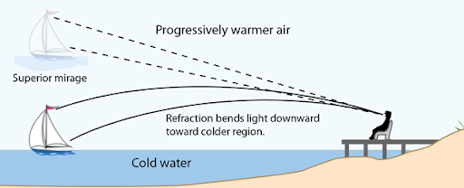 ಹೌದು, ನಾವು ಈಗಾಗಲೇ ತಿಳಿದಂತೆ, ವಾತಾವರಣದ ಹವಾಮಾನದಿಂದ ಸಮುದ್ರದ ನೀರಿನ ಬಳಿ ಹೆಚ್ಚು ಸಾಂದ್ರತೆ ಉಳ್ಳ ತಂಪಾದ ಗಾಳಿಯ ಪದರವಿದೆ. ಸಮುದ್ರದಿಂದ ಮೇಲ್ಮುಖವಾಗಿ ಚಲಿಸಿದಂತೆ ಕಡಿಮೆ ಸಾಂದ್ರತೆಯ, ಹೆಚ್ಚು ಉಷ್ಣವುಳ್ಳ ಗಾಳಿಯ ಪದರಗಳಿರುವುದರಿಂದ, ಬೆಳಕು ಹೆಚ್ಚು ಸಾಂದ್ರತೆಯ ಗಾಳಿಯ ಪದರದಿಂದ ಕಡಿಮೆ ಸಾಂದ್ರತೆಯ ಗಾಳಿಯ ಪದರದ ಕಡೆಗೆ ಚಲಿಸಿದಾಗ, ಹೆಚ್ಚು ಸಾಂದ್ರತೆವುಳ್ಳ ಗಾಳಿಯ ಪದರದ ಕಡೆಗೆ ಬಾಗುತ್ತಿದೆ. ಈ ಕಾರಣದಿಂದ ಹಡಗಿನಿಂದ ಬರುವ ಬೆಳಕಿನ ಕಿರಣಗಳು ಸಮುದ್ರ ಮಟ್ಟದಿಂದ ತಾಪಮಾನ ಹೆಚ್ಚಾಗುತ್ತಿರುವ ಗಾಳಿಯ ಪದರಗಳ ಮೂಲಕ ಹಾದು ಹಲವು ಬಾರಿ ವಕ್ರೀಭವನಗೊಂಡು ವ್ಯಕ್ತಿಯ ಕಣ್ಣಿಗೆ ಬೀಳುತ್ತಿದೆ.