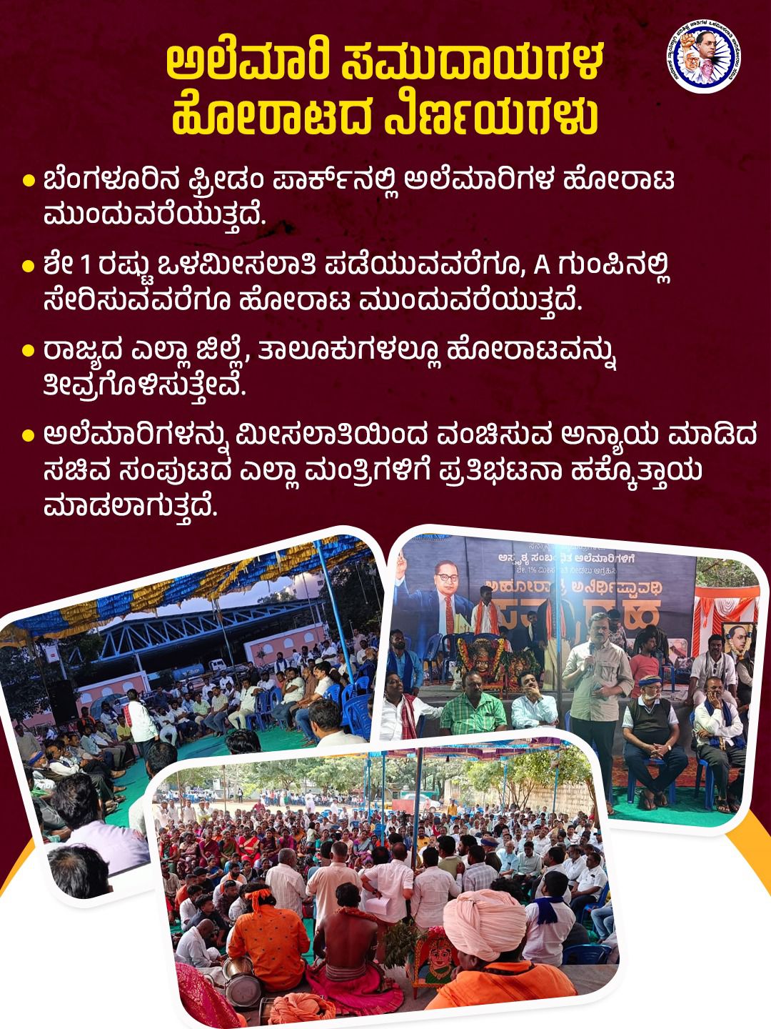 ಸಿಎಂ ಸಭೆಯಲ್ಲಿ ಬೇಡಿಕೆ ಈಡೇರದ ಹಿನ್ನೆಲೆ ಹೋರಾಟ ಮುಂದುವರಿಸಲು ಅಲೆಮಾರಿ ಸಮುದಾಯದ ಮುಖಂಡರು ಮತ್ತು ಇತರ ಹೋರಾಟಗಾರರು ತೀರ್ಮಾನಿಸಿದ್ದಾರೆ.