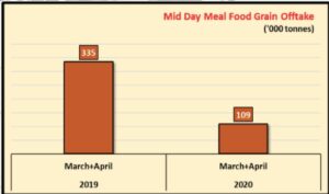 ಪ್ರಸ್ತುತ 1 ರಿಂದ 8 ತರಗತಿಗಳಲ್ಲಿ ಕಲಿಯುತ್ತಿರುವ ಅಂದಾಜು 12 ಕೋಟಿ ಮಕ್ಕಳಿಗೆ ಆಹಾರವನ್ನು ನೀಡುತ್ತಿರುವ ಮಧ್ಯಾಹ್ನದ ಊಟದ ಕಾರ್ಯಕ್ರಮದ ಆಹಾರ ಧಾನ್ಯಗಳು ಲಾಕ್ಡೌನ್ನಿಂದಾಗಿ 335 ಟನ್ಗಳಿಂದ ಕೇವಲ 109 ಟನ್ಗಳಿಗೆ ಕುಸಿದಿದೆ. ಇದು ಕಳೆದ ವರ್ಷ ಇದೇ ಅವಧಿಗಿಂತ ಮೂರನೇ ಒಂದು ಭಾಗದಷ್ಟು ಕಡಿಮೆಯಾಗಿದೆ.
