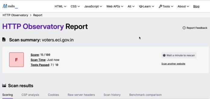 ಗೋಪಿನಾಥನ್ ಅವರು “ಮೊಜಿಲ್ಲಾ ಅಬ್ಸರ್ವೇಟರಿ ಸ್ಕೋರ್ 15/100 (ಎಫ್) ಆಗಿದ್ದು, ಇದು ಅಪಾಯಕಾರಿ ವೈಫಲ್ಯ” ಎಂದು ಸ್ಪಷ್ಟವಾಗಿ ಉಲ್ಲೇಖಿಸಿದ್ದಾರೆ. ಈ ಕಳಪೆ ಗ್ರೇಡ್ ಲಕ್ಷಾಂತರ ಭಾರತೀಯ ಮತದಾರರ ನೋಂದಣಿ, ಅಳಿಸುವಿಕೆ ಮತ್ತು ಸೂಕ್ಷ್ಮ ವೈಯಕ್ತಿಕ ದತ್ತಾಂಶವನ್ನು ನಿರ್ವಹಿಸುವ ವೇದಿಕೆಗಳಲ್ಲಿ ಮೂಲಭೂತ ಭದ್ರತಾ ಮಾನದಂಡಗಳ ವ್ಯವಸ್ಥಿತ ನಿರ್ಲಕ್ಷ್ಯವನ್ನು ಎತ್ತಿ ತೋರಿಸುತ್ತದೆ.