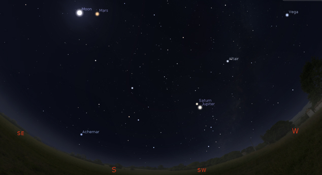 ದಿಗಂತದಲ್ಲಿ ಸೂರ್ಯ ಮುಳುಗಿದ ನಂತರ ಶನಿ ಮತ್ತು ಗುರು ಗ್ರಹವನ್ನು ನೋಡಿದ ಮೇಲೆ, ನೆತ್ತಿಯ ಮೇಲೆ ಆಚೀಚೆ ಕಣ್ಣು ಹಾಯಿಸಿದರೆ, ಕೆಂಪು ಬಣ್ಣದಲ್ಲಿ ಹೊಳೆಯುವ ಮತ್ತೊಂದು ಚುಕ್ಕಿ ಕಾಣುವುದು. ಸ್ಪಷ್ಟವಾಗಿ ವೀಕ್ಷಿಸಿದರೆ, ಈ ಕೆಂಪು ಚುಕ್ಕಿ ನಕ್ಷತ್ರಗಳಂತೆ ಮಿನುಗುವುದಿಲ್ಲ. ಇದು ಮಂಗಳ ಗ್ರಹ. ಮಂಗಳ ಗ್ರಹವನ್ನು ಕೆಂಪು ಗ್ರಹ ಎಂದು ಕರೆಯುತ್ತೇವೆ. ಏಕೆಂದರೆ, ಮಂಗಳನ ಅಂಗಳದಲ್ಲಿ ಅಂದರೆ, ಮಣ್ಣಿನಲ್ಲಿ ಕಬ್ಬಿಣಾಂಶದ ಖನಿಜಗಳು ಹೆಚ್ಚಿರುವುದರಿಂದ, ತುಕ್ಕು ಹೆಚ್ಚಾಗಿ, ಮಂಗಳನ ನೆಲ ಮತ್ತು ಅದರ ವಾತಾವರಣ ಕೆಂಪಾಗಿ ಕಾಣುತ್ತದೆ. ಮಂಗಳ ಸರಿ ಸುಮಾರು ಮುಂಜಾನೆ ಎರಡು ಗಂಟೆಗೆ ಮುಳುಗುವುದರಿಂದ, ಅಲ್ಲಿಯವರೆಗೂ ರಾತ್ರಿ ಆಕಾಶದಲ್ಲಿ ಮಂಗಳ ಗ್ರಹವನ್ನು ವೀಕ್ಷಿಸಬಹುದು.